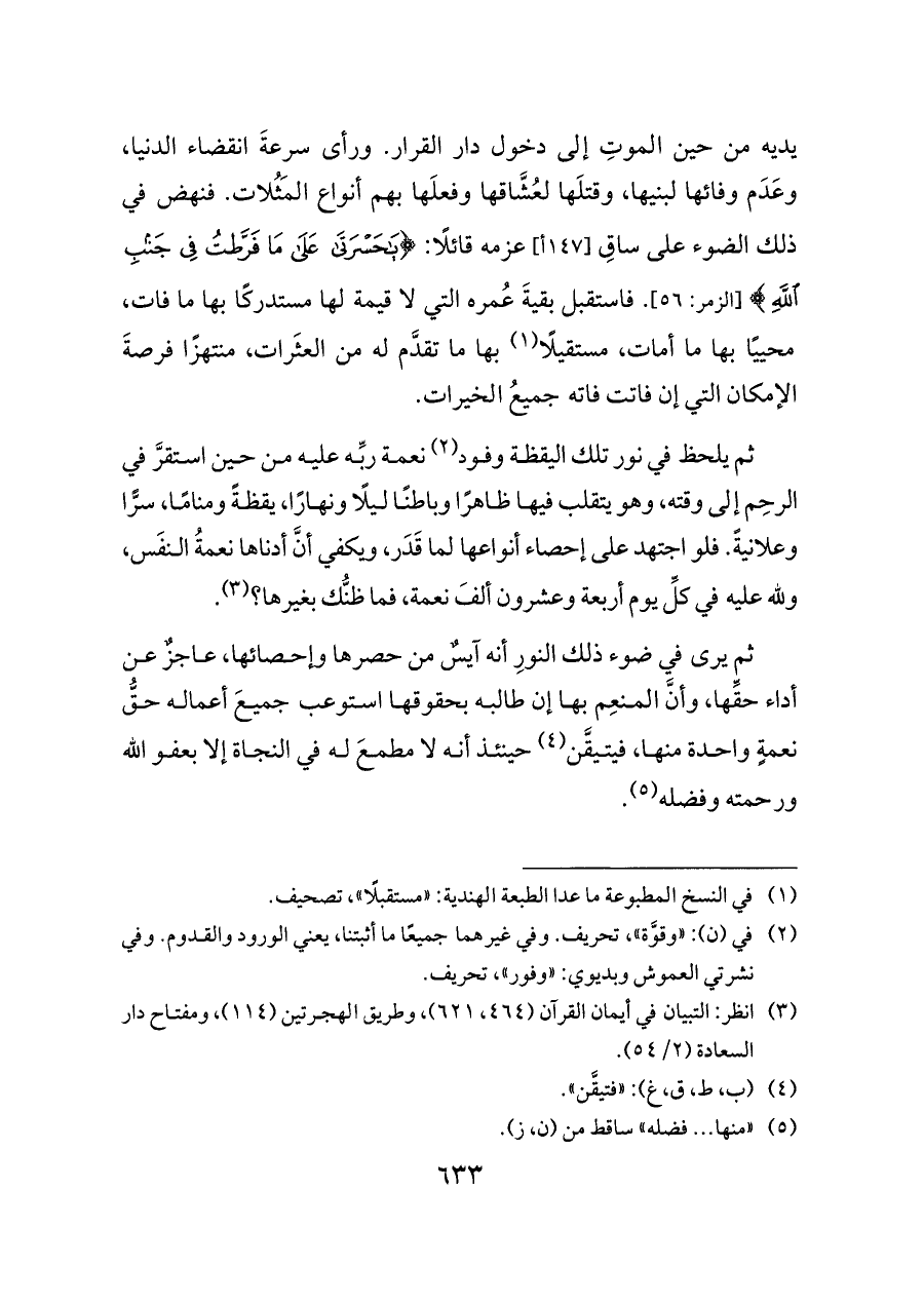 يديه من حين الموتِ إلى دخول دار القرار. ورأى سرعةَ انقضاء الدنيا، وعَدَم وفائها لبنيها، وقتلَها لعُشَّاقها وفعلَها بهم أنواع المَثُلات. فنهض في ذلك الضوء على ساقِ [١٤٧ أ] عزمه قائلًا: {يَاحَسْرَتَا عَلَى مَا فَرَّطْتُ فِي جَنْبِ اللَّهِ} [الزمر: ٥٦]. فاستقبل بقيةَ عُمره التي لا قيمة لها مستدركًا بها ما فات، محييًا بها ما أمات، مستقيلًا (¬١) بها ما تقدَّم له من العثَرات، منتهزًا فرصةَ الإمكان التي إن فاتت فاته جميعُ الخيرات.