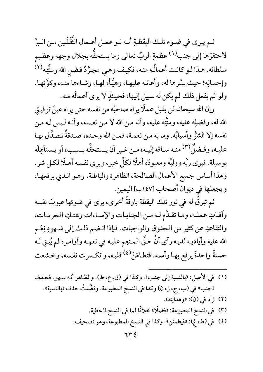 ثم يرى في ضوء تلك اليقظةِ أنه لو عمل أعمال الثَّقَلَين من البرِّ لاحتقرَها إلى جنب (¬١) عظمةِ الربِّ تعالى وما يستحقُّه بجلال وجهه وعظيم سلطانه. هذا لو كانت أعمالُه منه، فكيف وهي مجرَّدُ فضلِ الله ومنَّتِه (¬٢) وإحسانِه؛ حيث يسَّرها له، وأعانه عليها، وهيَّأه لها، وشاءها منه، وكوَّنها. ولو لم يفعل ذلك لم يكن له سبيل إليها، فحينئذٍ لا يرى أعمالَه منه.