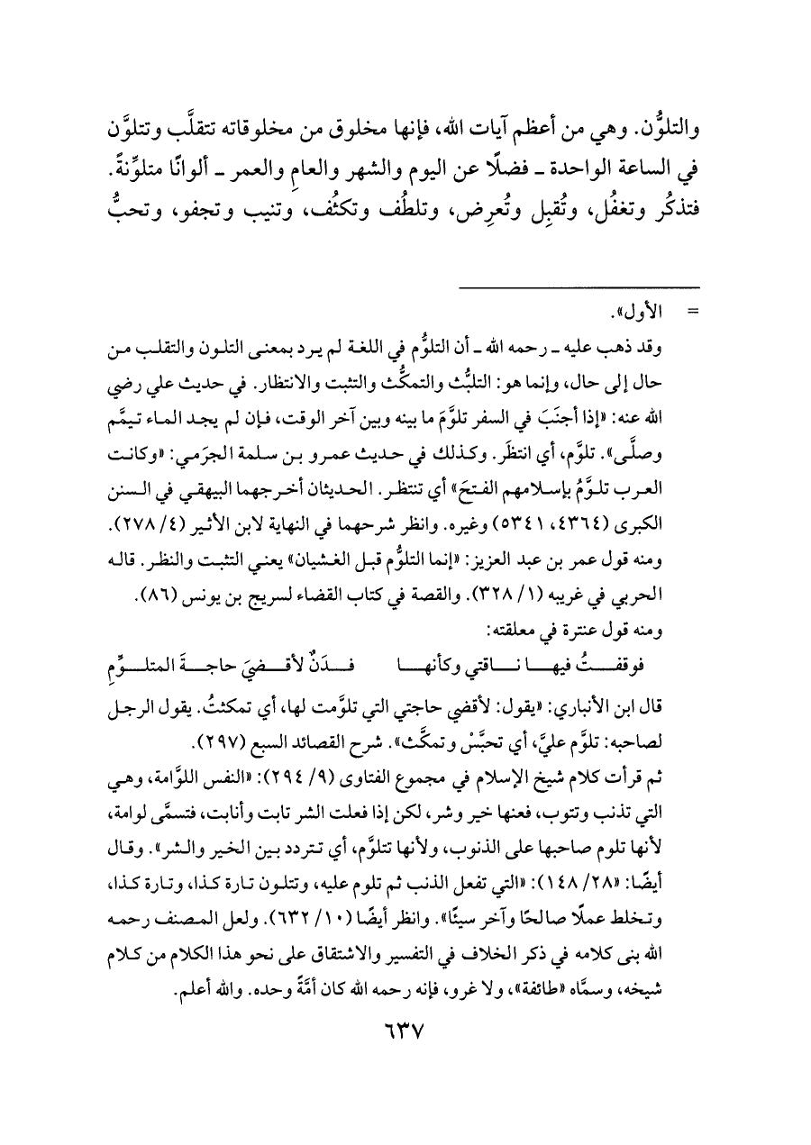 والتلوُّن. وهي من أعظم آيات الله، فإنها مخلوق من مخلوقاته تتقلَّب وتتلوَّن في الساعة الواحدة ــ فضلًا عن اليوم والشهر والعامِ والعمر ــ ألوانًا متلوِّنةً. فتذكُر وتغفُل، وتُقبِل وتُعرِض، وتلطُف وتكثُف، وتنيب وتجفو، وتحبُّ