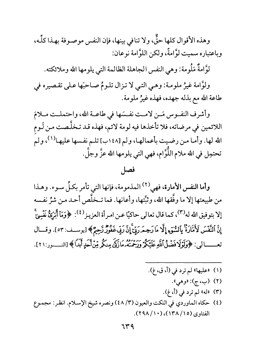 وأشرف النفوس مَن لامت نفسَها في طاعة الله، واحتملت ملامَ اللائمين في مرضاته، فلا تأخذها فيه لومة لائم، فهذه قد تخلَّصت من لَومِ الله لها. وأما من رضيت بأعمالها، ولم [١٤٨ ب] تلم نفسها عليها (¬١)، ولم تحتمِل في الله ملام اللُّوَّام، فهي التي يلومها الله عزَّ وجلَّ.