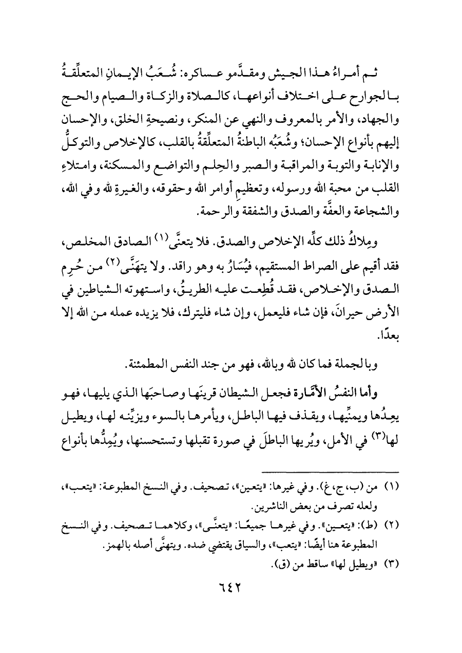 ثم أمراءُ هذا الجيش ومقدَّمو عساكره: شُعَبُ الإيمانِ المتعلِّقةُ بالجوارح على اختلاف أنواعها، كالصلاة والزكاة والصيام والحج والجهاد، والأمر بالمعروف والنهي عن المنكر، ونصيحةِ الخلق، والإحسان إليهم بأنواع الإحسان؛ وشُعَبُه الباطنةُ المتعلِّقةُ بالقلب، كالإخلاص والتوكلُّ والإنابة والتوبة والمراقبة والصبر والحِلم والتواضع والمسكنة، وامتلاءِ القلب من محبة الله ورسوله، وتعظيمِ أوامر الله وحقوقه، والغيرةِ لله وفي الله، والشجاعة والعفَّة والصدق والشفقة والرحمة.