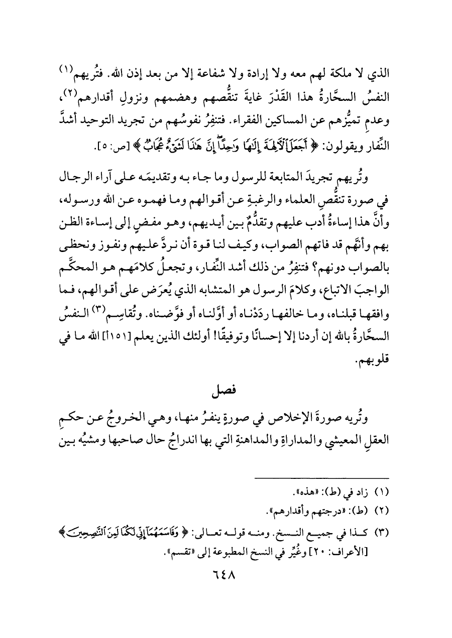 وتُريهم تجريدَ المتابعة للرسول وما جاء به وتقديمَه على آراء الرجال في صورة تنقُّصِ العلماء والرغبةِ عن أقوالهم وما فهموه عن الله ورسوله، وأنَّ هذا إساءةُ أدب عليهم وتقدُّمٌ بين أيديهم، وهو مفضٍ إلى إساءة الظن بهم وأنَّهم قد فاتهم الصواب، وكيف لنا قوة أن نردَّ عليهم ونفوز ونحظى بالصواب دونهم؟ فتنفِرُ من ذلك أشد النِّفار، وتجعلُ كلامَهم هو المحكَّم الواجبَ الاتباع، وكلامَ الرسول هو المتشابه الذي يُعرَض على أقوالهم، فما وافقها قبلناه، وما خالفها ردَدْناه أو أوَّلناه أو فوَّضناه. وتُقاسِم (¬٣) النفسُ السحَّارةُ بالله إن أردنا إلا إحسانًا وتوفيقًا! أولئك الذين يعلم [١٥١ أ] الله ما في قلوبهم.