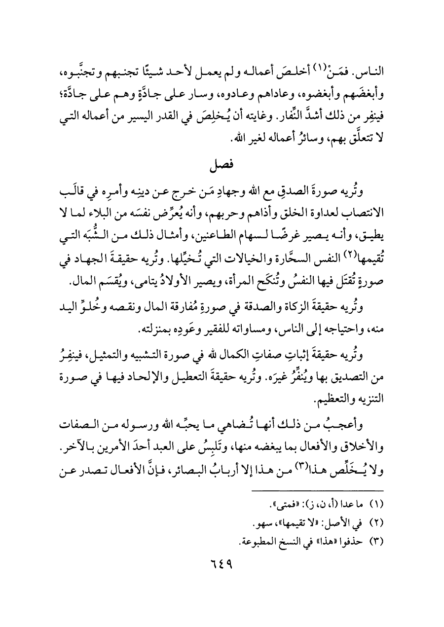 وتُريه صورةَ الصدقِ مع الله وجهادِ مَن خرج عن دينِه وأمرِه في قالَب الانتصاب لعداوة الخلق وأذاهم وحربهم، وأنه يُعرِّض نفسَه من البلاء لما لا يطيق، وأنه يصير غرضًا لسهام الطاعنين، وأمثال ذلك من الشُّبَه التي تُقيمها (¬٢) النفس السحَّارة والخيالات التي تُخيِّلها. وتُريه حقيقةَ الجهاد في صورةٍ تُقتَل فيها النفسُ وتُنكَح المرأة، ويصير الأولادُ يتامى، ويُقسَم المال.