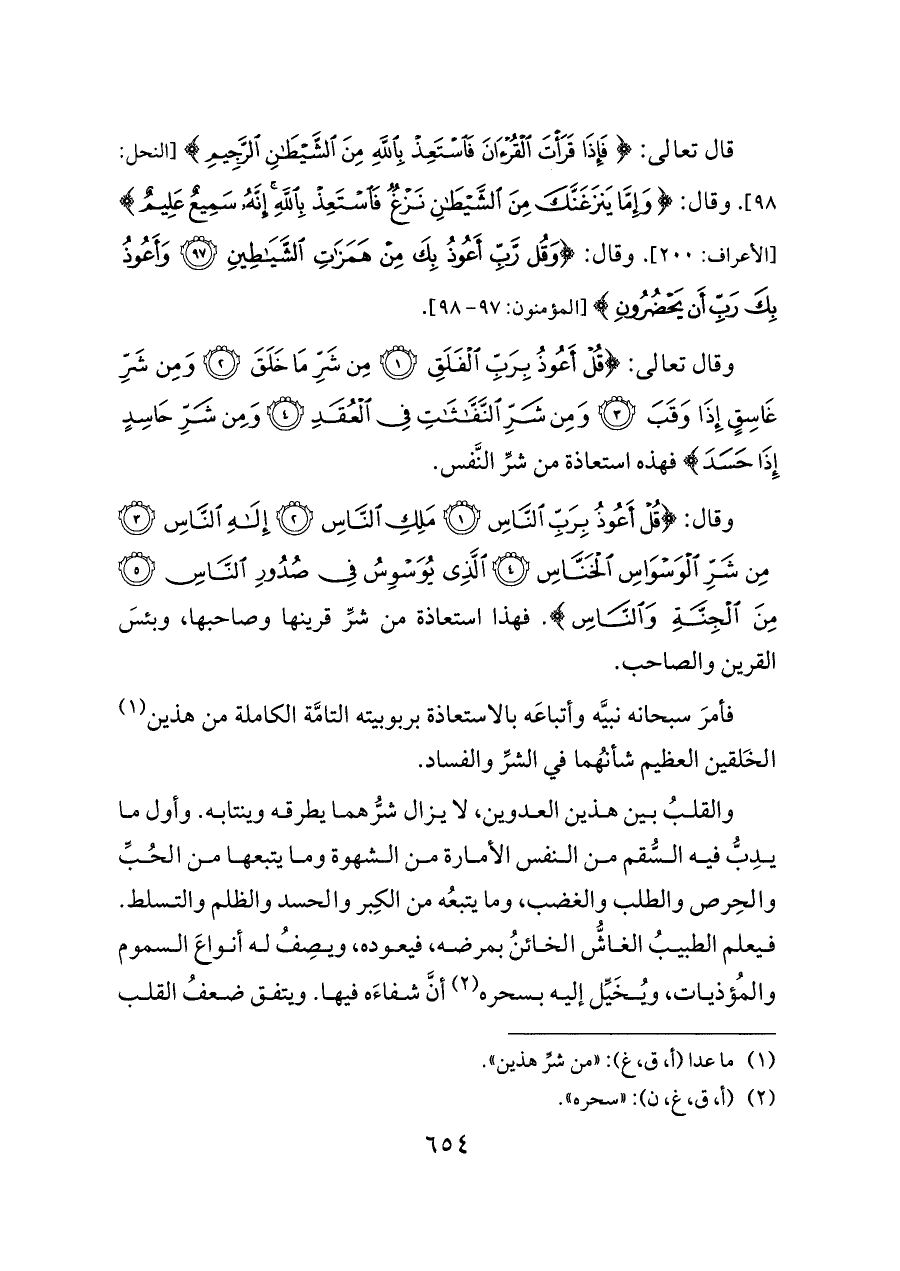 فأمرَ سبحانه نبيَّه وأتباعَه بالاستعاذة بربوبيته التامَّة الكاملة من هذين (¬١) الخَلقين العظيم شأنُهما في الشرِّ والفساد.