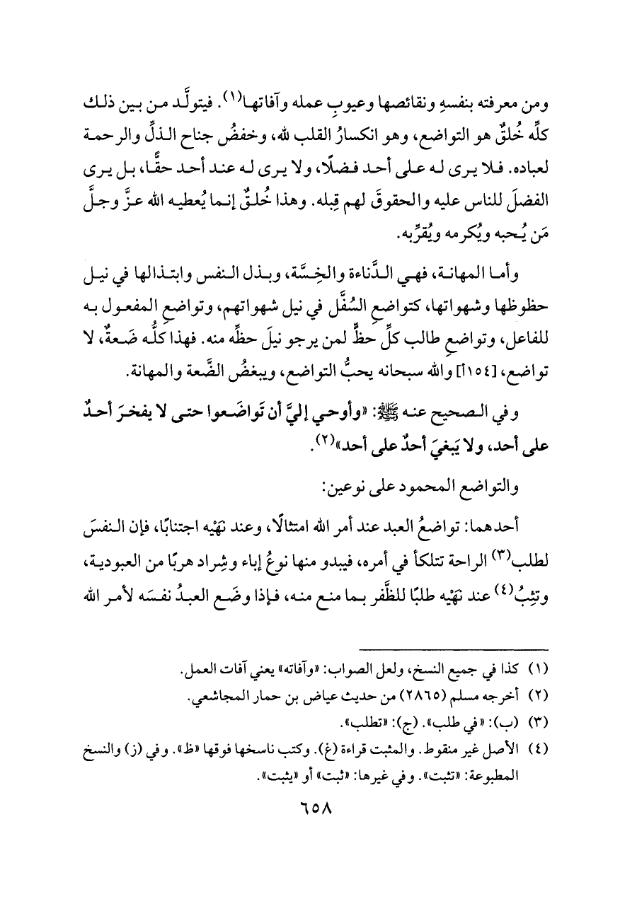 ومن معرفته بنفسهِ ونقائصها وعيوبِ عمله وآفاتها (¬١). فيتولَّد من بين ذلك كلِّه خُلقٌ هو التواضع، وهو انكسارُ القلب لله، وخفضُ جناح الذلِّ والرحمة لعباده. فلا يرى له على أحد فضلًا، ولا يرى له عند أحد حقًّا، بل يرى الفضلَ للناس عليه والحقوقَ لهم قِبله. وهذا خُلقٌ إنما يُعطيه الله عزَّ وجلَّ مَن يُحبه ويُكرمه ويُقرِّبه.