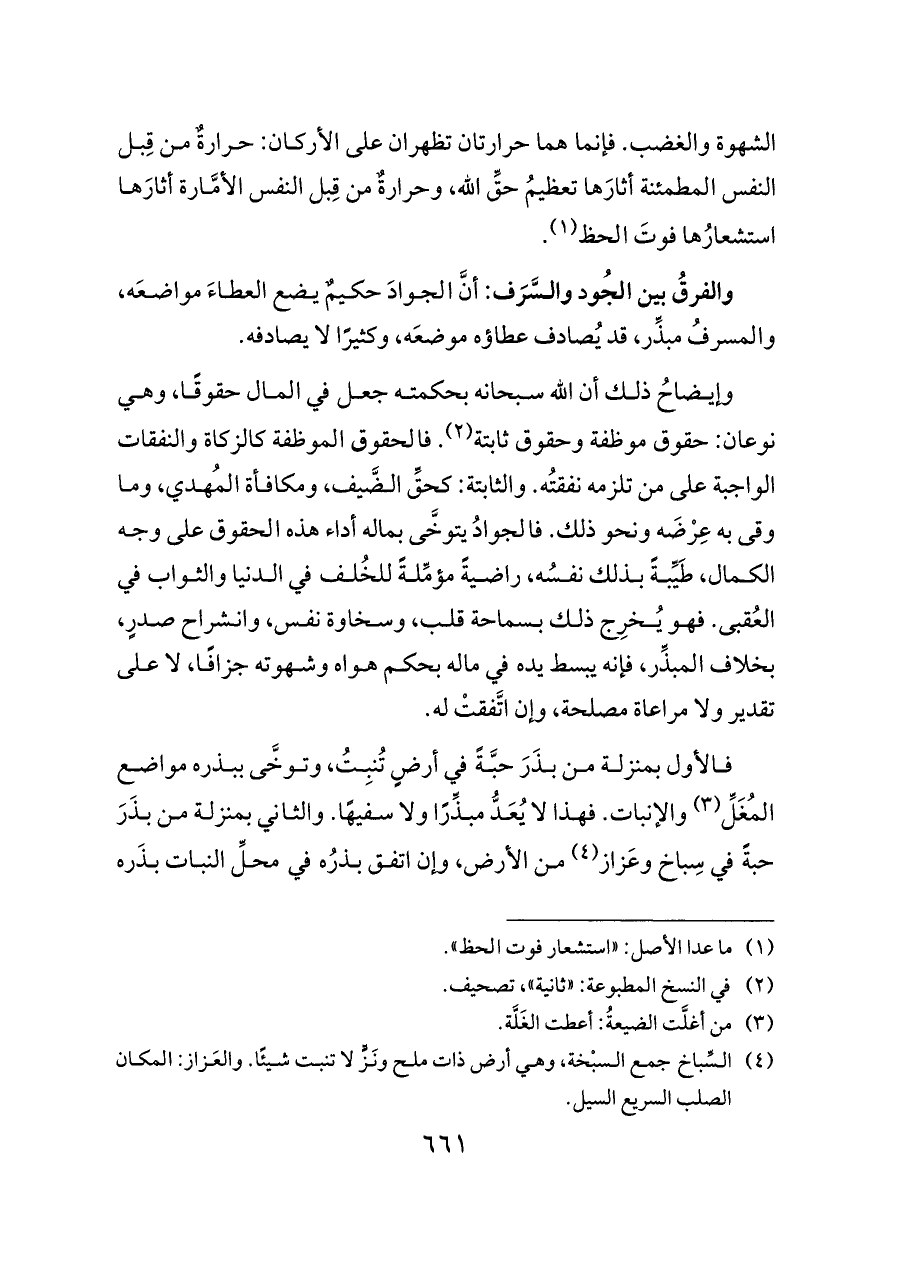 وإيضاحُ ذلك أن الله سبحانه بحكمته جعل في المال حقوقًا، وهي نوعان: حقوق موظفة وحقوق ثابتة (¬٢). فالحقوق الموظفة كالزكاة والنفقات الواجبة على من تلزمه نفقتُه. والثابتة: كحقِّ الضَّيف، ومكافأة المُهدي، وما وقى به عِرْضَه ونحو ذلك. فالجوادُ يتوخَّى بماله أداء هذه الحقوق على وجه الكمال، طَيِّبةً بذلك نفسُه، راضيةً مؤمِّلةً للخُلف في الدنيا والثواب في العُقبى. فهو يُخرِج ذلك بسماحة قلب، وسخاوة نفس، وانشراح صدرٍ، بخلاف المبذِّر، فإنه يبسط يده في ماله بحكم هواه وشهوته جزافًا، لا على تقدير ولا مراعاة مصلحة، وإن اتَّفقتْ له.