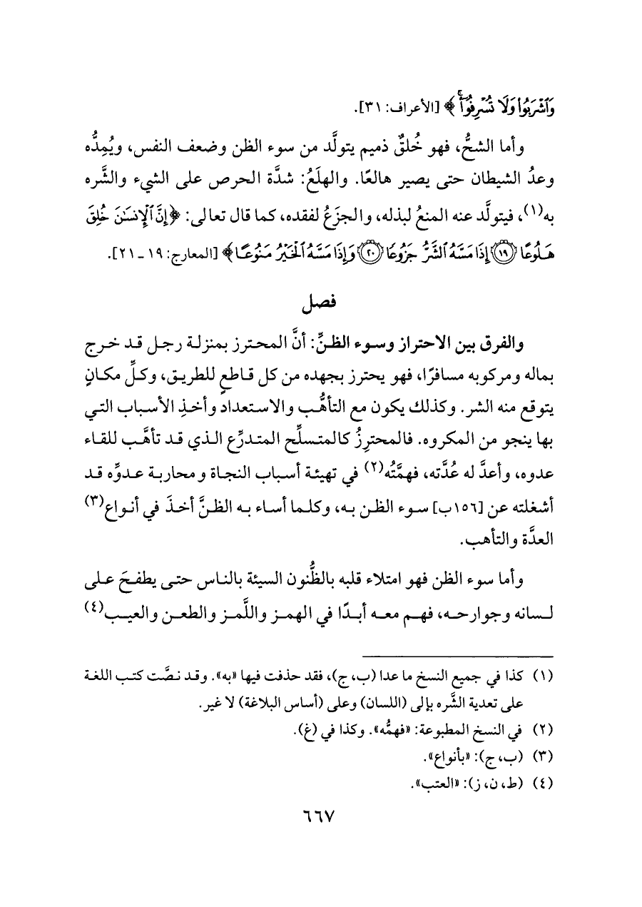 والفرق بين الاحتراز وسوء الظنِّ: أنَّ المحترز بمنزلة رجل قد خرج بماله ومركوبه مسافرًا، فهو يحترز بجهده من كل قاطعٍ للطريق، وكلِّ مكانٍ يتوقع منه الشر. وكذلك يكون مع التأهُّب والاستعداد وأخذِ الأسباب التي بها ينجو من المكروه. فالمحترِزُ كالمتسلِّح المتدرِّع الذي قد تأهَّب للقاء عدوه، وأعدَّ له عُدَّته، فهمَّتُه (¬٢) في تهيئة أسباب النجاة ومحاربة عدوِّه قد أشغلته عن [١٥٦ ب] سوء الظن به، وكلما أساء به الظنَّ أخذَ في أنواع (¬٣) العدَّة والتأهب.