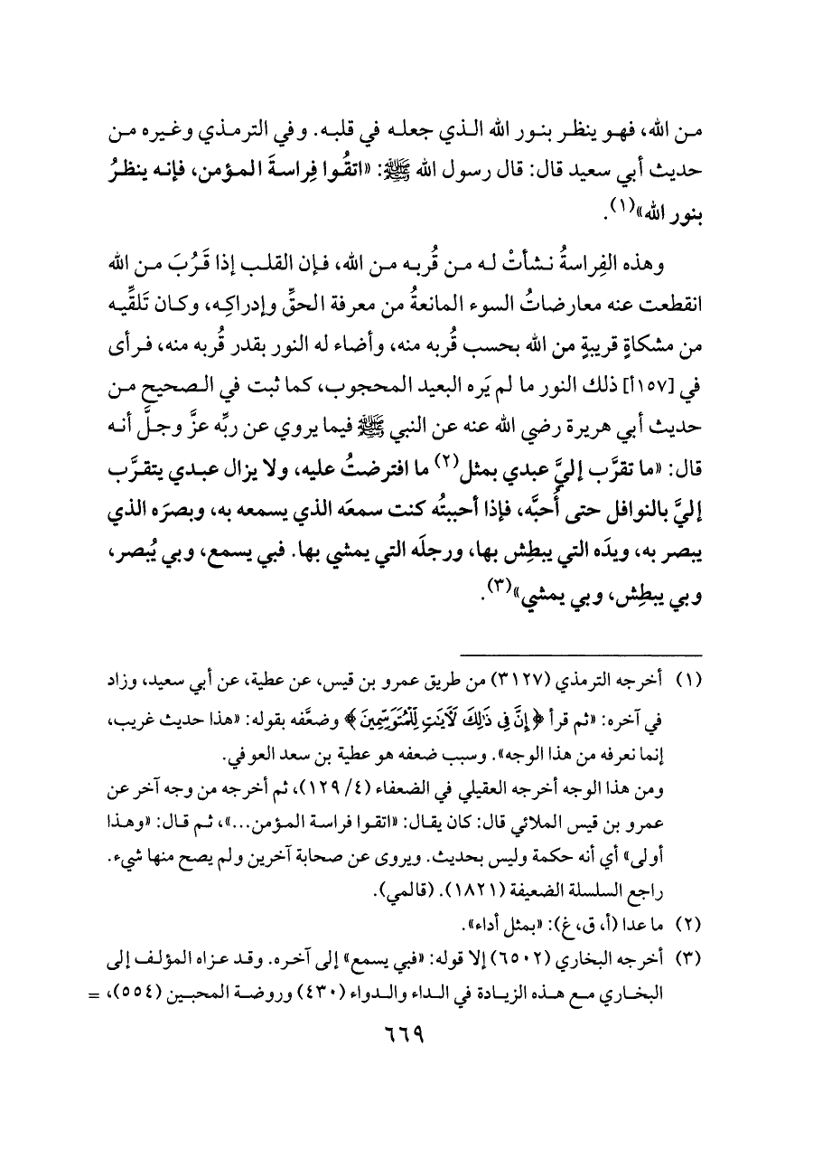 وهذه الفِراسةُ نشأتْ له من قُربه من الله، فإن القلب إذا قَرُبَ من الله انقطعت عنه معارضاتُ السوء المانعةُ من معرفة الحقِّ وإدراكِه، وكان تَلقِّيه من مشكاةٍ قريبةٍ من الله بحسب قُربه منه، وأضاء له النور بقدر قُربه منه، فرأى في [١٥٧ أ] ذلك النور ما لم يَره البعيد المحجوب، كما ثبت في الصحيح من حديث أبي هريرة رضي الله عنه عن النبي - صلى الله عليه وسلم - فيما يروي عن ربِّه عزَّ وجلَّ أنه قال: «ما تقرَّب إليَّ عبدي بمثل (¬٢) ما افترضتُ عليه، ولا يزال عبدي يتقرَّب إليَّ بالنوافل حتى أُحبَّه، فإذا أحببتُه كنت سمعَه الذي يسمعه به، وبصرَه الذي يبصر به، ويدَه التي يبطِش بها، ورجلَه التي يمشي بها. فبي يسمع، وبي يُبصر، وبي يبطِش، وبي يمشي» (¬٣).