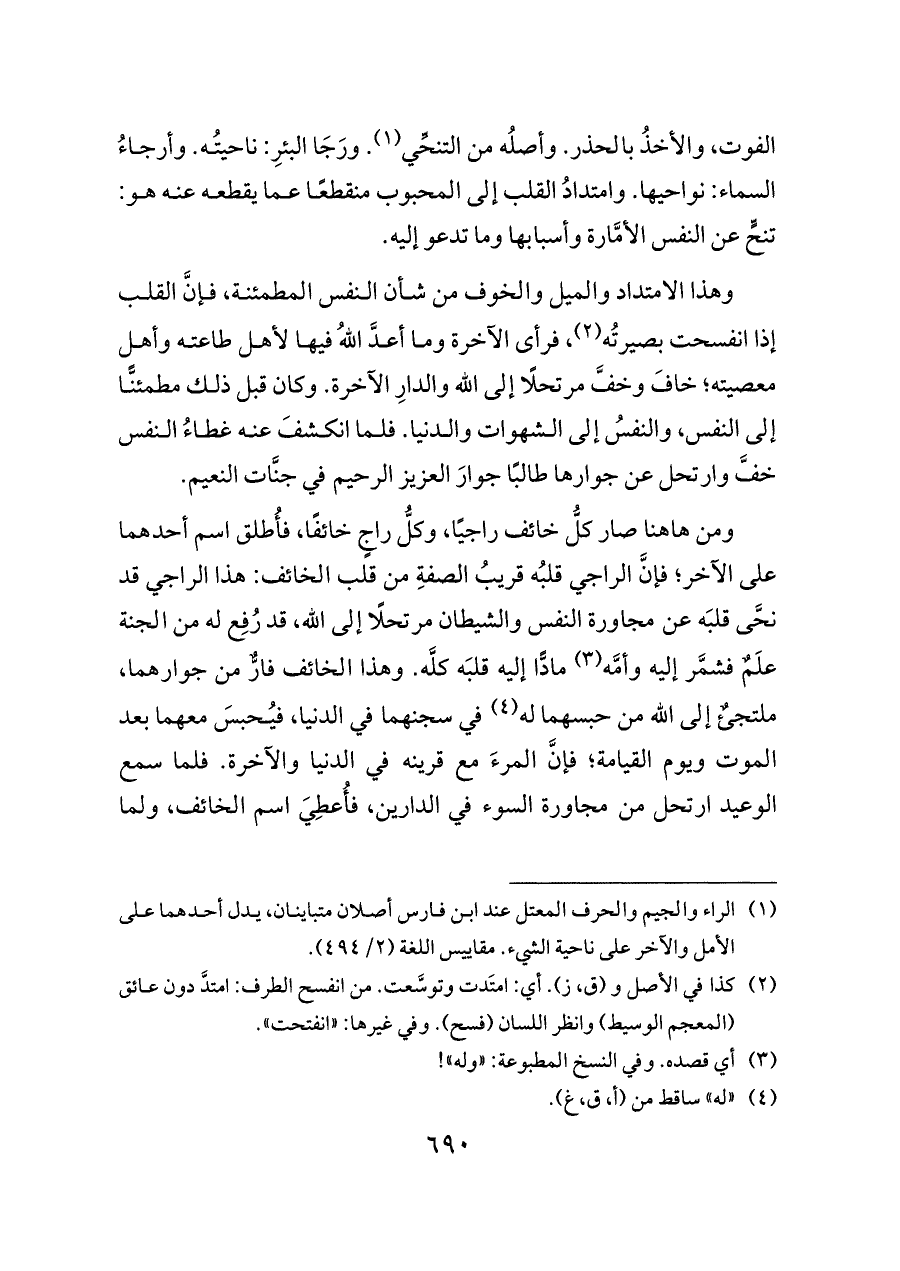 الفوت، والأخذُ بالحذر. وأصلُه من التنحِّي (¬١). ورَجَا البئرِ: ناحيتُه. وأرجاءُ السماء: نواحيها. وامتدادُ القلب إلى المحبوب منقطعًا عما يقطعه عنه هو: تنحٍّ عن النفس الأمَّارة وأسبابها وما تدعو إليه.