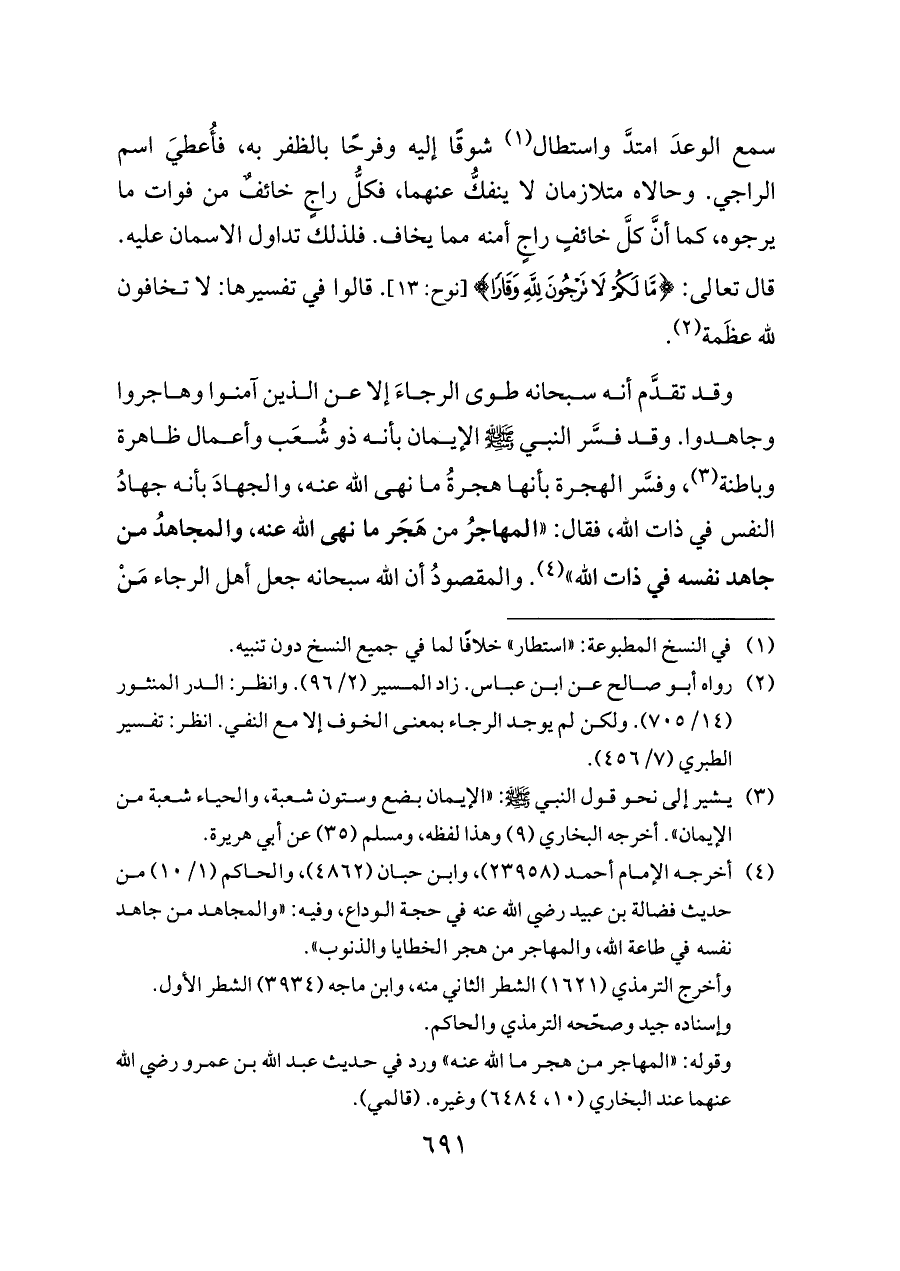 وقد تقدَّم أنه سبحانه طوى الرجاءَ إلا عن الذين آمنوا وهاجروا وجاهدوا. وقد فسَّر النبي - صلى الله عليه وسلم - الإيمان بأنه ذو شُعَب وأعمال ظاهرة وباطنة (¬٣)، وفسَّر الهجرة بأنها هجرةُ ما نهى الله عنه، والجهادَ بأنه جهادُ النفس في ذات الله، فقال: «المهاجرُ من هَجَر ما نهى الله عنه، والمجاهدُ من جاهد نفسه في ذات الله» (¬٤). والمقصودُ أن الله سبحانه جعل أهل الرجاء مَنْ