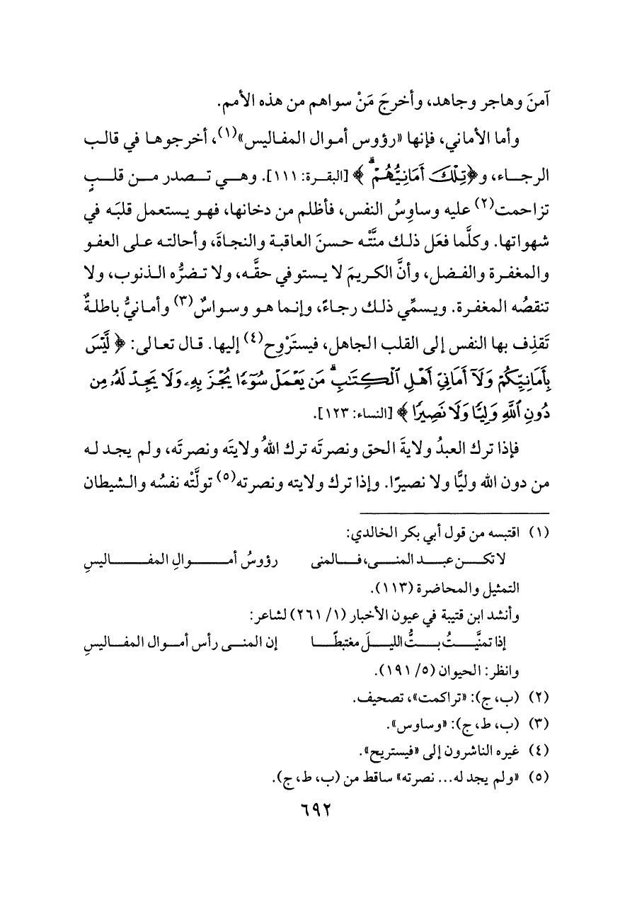 أخرجوها في قالب الرجاء، و {تِلْكَ أَمَانِيُّهُمْ} [البقرة: ١١١]. وهي تصدر من قلبٍ تزاحمت (¬٢) عليه وساوِسُ النفس، فأظلم من دخانها، فهو يستعمل قلبَه في شهواتها. وكلَّما فعَل ذلك منَّتْه حسنَ العاقبة والنجاةَ، وأحالته على العفو والمغفرة والفضل، وأنَّ الكريمَ لا يستوفي حقَّه، ولا تضرُّه الذنوب، ولا تنقصُه المغفرة. ويسمِّي ذلك رجاءً، وإنما هو وسواسٌ (¬٣) وأمانيُّ باطلةٌ تَقذِف بها النفس إلى القلب الجاهل، فيستَرْوِح (¬٤) إليها. قال تعالى: {لَيْسَ بِأَمَانِيِّكُمْ وَلَا أَمَانِيِّ أَهْلِ الْكِتَابِ مَنْ يَعْمَلْ سُوءًا يُجْزَ بِهِ وَلَا يَجِدْ لَهُ مِنْ دُونِ اللَّهِ وَلِيًّا وَلَا نَصِيرًا} [النساء: ١٢٣].