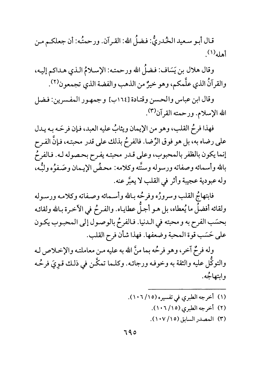 قال أبو سعيد الخُدريُّ: فضلُ الله: القرآن. ورحمتُه: أن جعلكم من أهله (¬١).