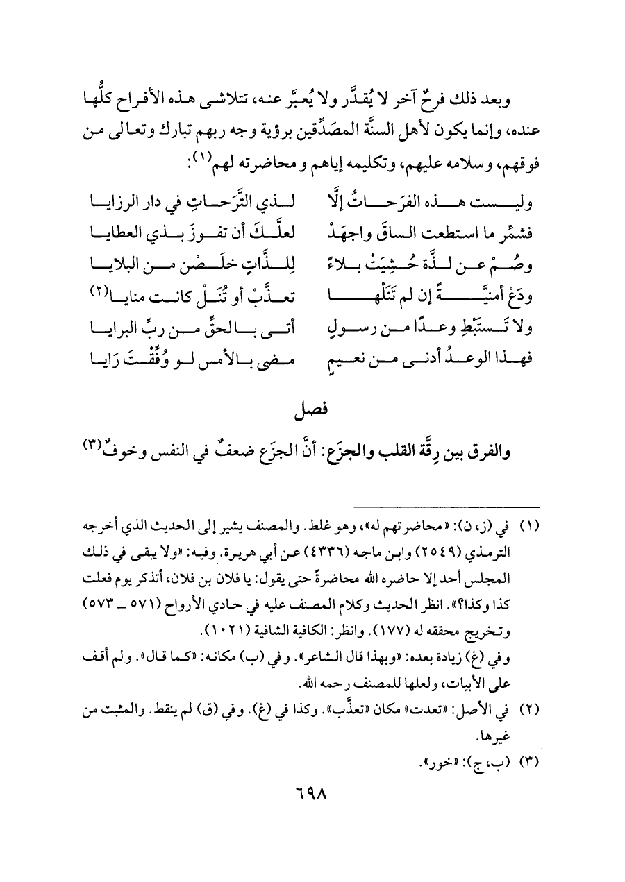 وبعد ذلك فرحٌ آخر لا يُقدَّر ولا يُعبَّر عنه، تتلاشى هذه الأفراح كلُّها عنده، وإنما يكون لأهل السنَّة المصَدِّقين برؤية وجه ربهم تبارك وتعالى من فوقهم، وسلامه عليهم، وتكليمه إياهم ومحاضرته لهم (¬١):