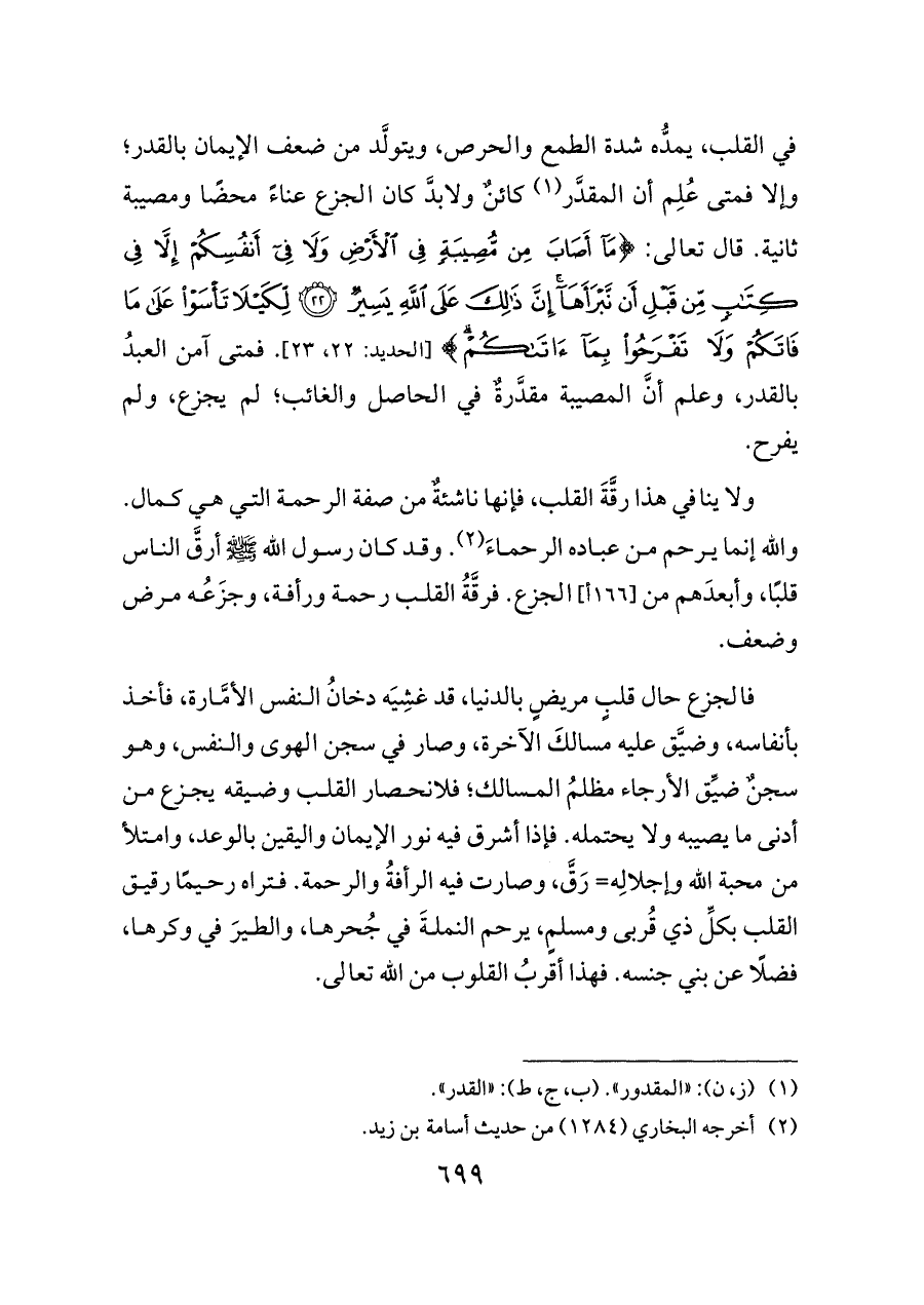 ولا ينافي هذا رقَّةَ القلب، فإنها ناشئةٌ من صفة الرحمة التي هي كمال. والله إنما يرحم من عباده الرحماءَ (¬٢). وقد كان رسول الله - صلى الله عليه وسلم - أرقَّ الناس قلبًا، وأبعدَهم من [١٦٦ أ] الجزع. فرقَّةُ القلب رحمة ورأفة، وجزَعُه مرض وضعف.