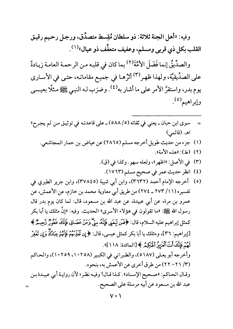 والصدِّيقُ إنما فَضَلَ الأمَّةَ (¬٢) بما كان في قلبه من الرحمة العامة زيادةً على الصدِّيقيَّة، ولهذا ظهر (¬٣) أثرُها في جميع مقاماته، حتى في الأسارى يوم بدر، واستقرَّ الأمر على ما أشار به (¬٤). وضرَب له النبي - صلى الله عليه وسلم - مثلًا بعيسى وإبراهيم (¬٥).