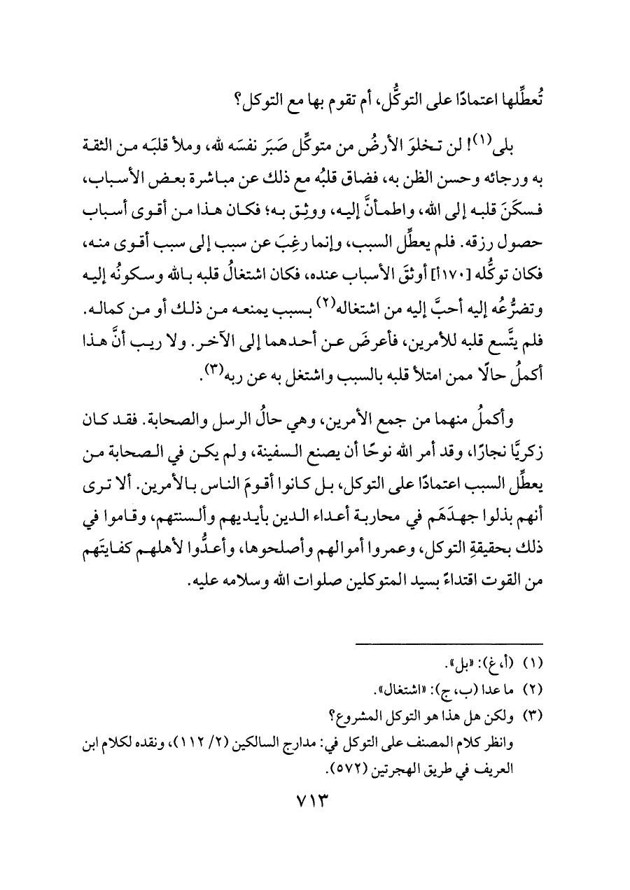 وأكملُ منهما من جمع الأمرين، وهي حالُ الرسل والصحابة. فقد كان زكريَّا نجارًا، وقد أمر الله نوحًا أن يصنع السفينة، ولم يكن في الصحابة من يعطِّل السبب اعتمادًا على التوكل، بل كانوا أقومَ الناس بالأمرين. ألا ترى أنهم بذلوا جهدَهَم في محاربة أعداء الدين بأيديهم وألسنتهم، وقاموا في ذلك بحقيقةِ التوكل، وعمروا أموالهم وأصلحوها، وأعدُّوا لأهلهم كفايتَهم من القوت اقتداءً بسيد المتوكلين صلوات الله وسلامه عليه.