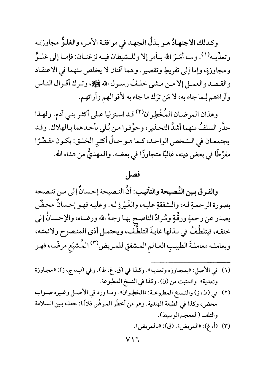 وهذان المرضان المُخْطِران (¬٢) قد استوليا على أكثر بني آدم. ولهذا حذَّر السلفُ منهما أشدَّ التحذير، وخوَّفوا من بُلي بأحدهما بالهلاك. وقد يجتمعان في الشخص الواحد، كما هو حالُ أكثرِ الخلق: يكون مقصِّرًا مفرِّطًا في بعض دينه، غاليًا متجاوزًا في بعضه. والمهديُّ من هداه الله.