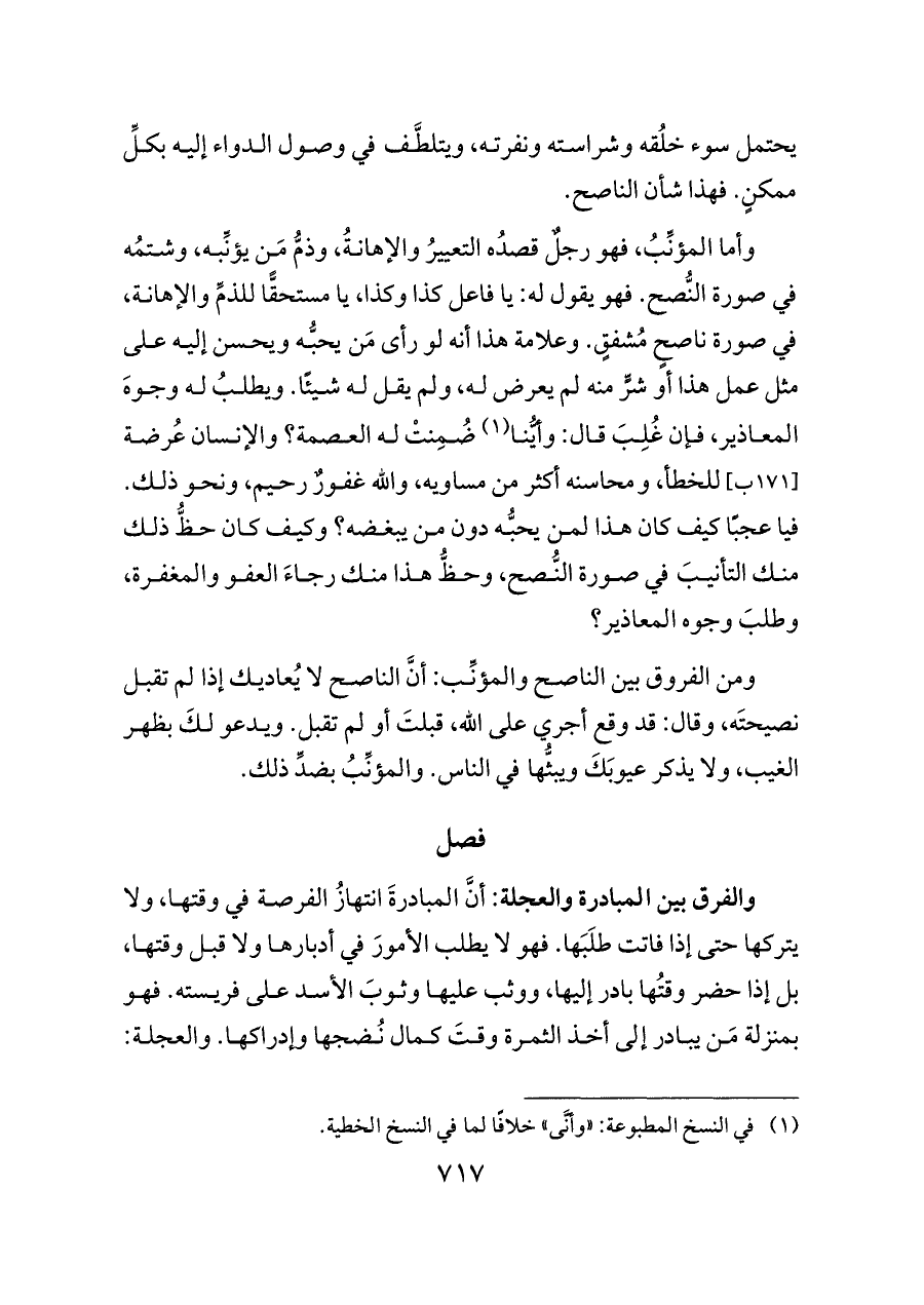 وأما المؤنِّبُ، فهو رجلٌ قصدُه التعييرُ والإهانةُ، وذمُّ مَن يؤنِّبه، وشتمُه في صورة النُّصح. فهو يقول له: يا فاعل كذا وكذا، يا مستحقًّا للذمِّ والإهانة، في صورة ناصحٍ مُشفقٍ. وعلامة هذا أنه لو رأى مَن يحبُّه ويحسن إليه على مثل عمل هذا أو شرٍّ منه لم يعرض له، ولم يقل له شيئًا. ويطلبُ له وجوهَ المعاذير، فإن غُلِبَ قال: وأيُّنا (¬١) ضُمِنتْ له العصمة؟ والإنسان عُرضة [١٧١ ب] للخطأ، ومحاسنه أكثر من مساويه، والله غفورٌ رحيم، ونحو ذلك. فيا عجبًا كيف كان هذا لمن يحبُّه دون من يبغضه؟ وكيف كان حظُّ ذلك منك التأنيبَ في صورة النُّصح، وحظُّ هذا منك رجاءَ العفو والمغفرة، وطلبَ وجوه المعاذير؟