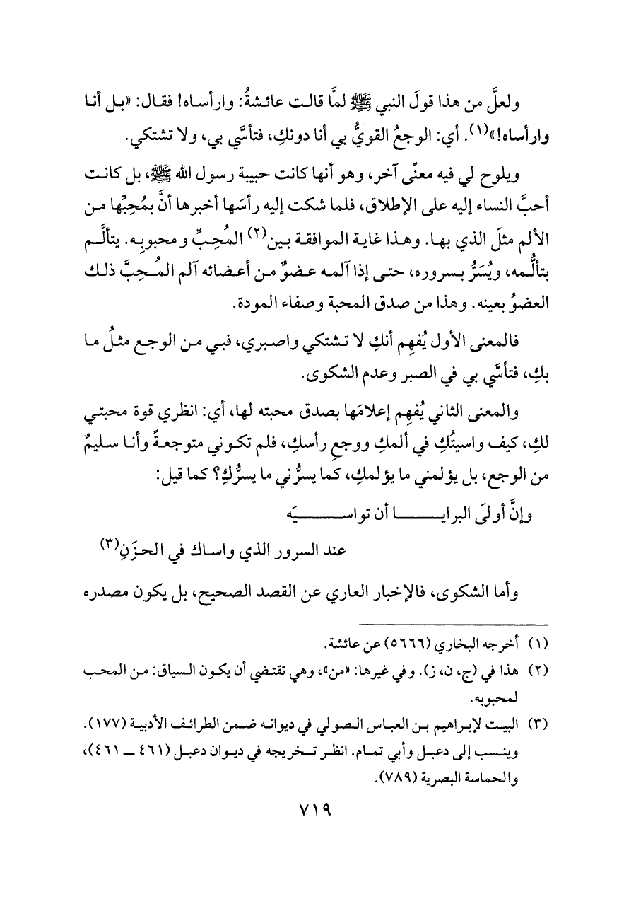 ويلوح لي فيه معنًى آخر، وهو أنها كانت حبيبة رسول الله - صلى الله عليه وسلم -، بل كانت أحبَّ النساء إليه على الإطلاق، فلما شكت إليه رأسَها أخبرها أنَّ بمُحِبِّها من الألم مثلَ الذي بها. وهذا غاية الموافقة بين (¬٢) المُحِبِّ ومحبوبِه. يتألَّم بتألُّمه، ويُسَرُّ بسروره، حتى إذا آلمه عضوٌ من أعضائه آلم المُحِبَّ ذلك العضوُ بعينه. وهذا من صدق المحبة وصفاء المودة.