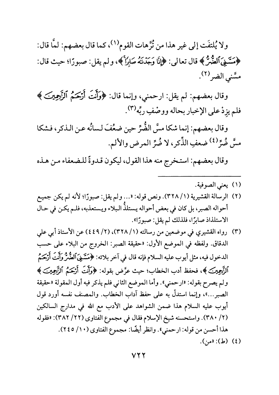 (¬٣) رواه القشيري في موضعين من رسالته (١/ ٣٢٨)، (٢/ ٤٤٩) عن الأستاذ أبي علي الدقاق. ولفظه في الموضع الأول: «حقيقة الصبر: الخروج من البلاء على حسب الدخول فيه، مثل أيوب عليه السلام فإنه قال في آخر بلائه: {مَسَّنِيَ الضُّرُّ وَأَنْتَ أَرْحَمُ الرَّاحِمِينَ}، فحفظ أدب الخطاب؛ حيث عرَّض بقوله: {وَأَنْتَ أَرْحَمُ الرَّاحِمِينَ} ولم يصرح بقوله: «ارحمني». وأما الموضع الثاني فلم يذكر فيه أول المقولة «حقيقة الصبر ... »، وإنما استدلّ به على حفظ آداب الخطاب. والمصنف نفسه أورد قول أيوب عليه السلام هذا ضمن الشواهد على الأدب مع الله في مدارج السالكين (٢/ ٣٨٠). واستحسنه شيخ الإسلام فقال في مجموع الفتاوى (٢٢/ ٣٨٢): «فقوله هذا أحسن من قوله: ارحمني». وانظر أيضًا: مجموع الفتاوى (١٠/ ٢٤٥).