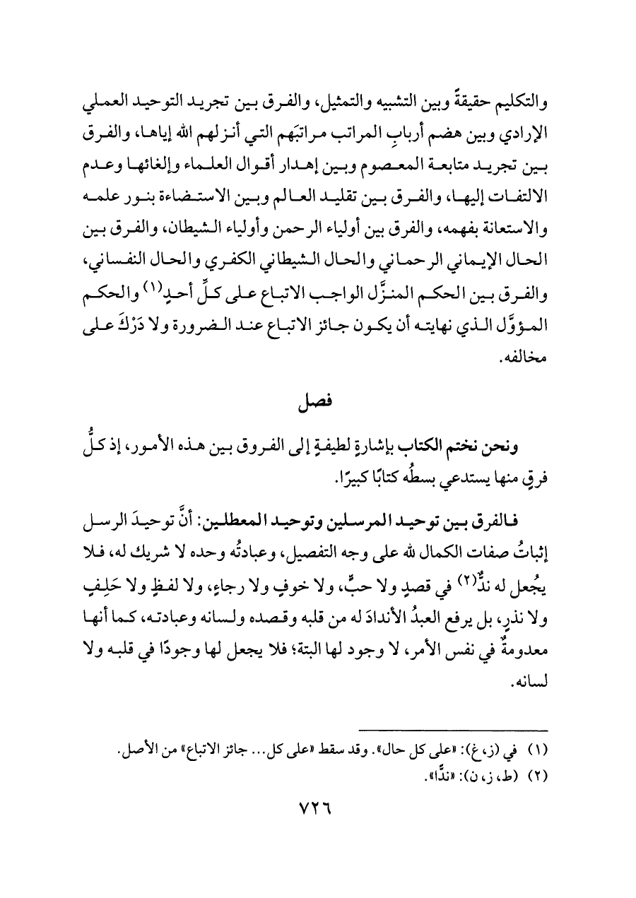 والتكليم حقيقةً وبين التشبيه والتمثيل، والفرق بين تجريد التوحيد العملي الإرادي وبين هضم أربابِ المراتب مراتبَهم التي أنزلهم الله إياها، والفرق بين تجريد متابعة المعصوم وبين إهدار أقوال العلماء وإلغائها وعدم الالتفات إليها، والفرق بين تقليد العالم وبين الاستضاءة بنور علمه والاستعانة بفهمه، والفرق بين أولياء الرحمن وأولياء الشيطان، والفرق بين الحال الإيماني الرحماني والحال الشيطاني الكفري والحال النفساني، والفرق بين الحكم المنزَّل الواجب الاتباع على كلِّ أحدٍ (¬١) والحكم المؤوَّل الذي نهايته أن يكون جائز الاتباع عند الضرورة ولا دَرْكَ على مخالفه.