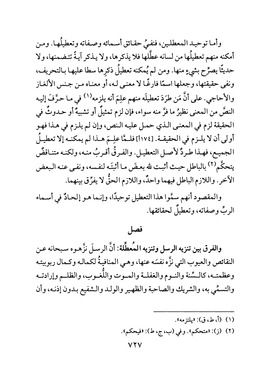 وأما توحيد المعطلين، فنفيُ حقائق أسمائه وصفاته وتعطيلُها. ومن أمكنه منهم تعطيلُها من لسانه عطَّلها فلا يذكرها، ولا يذكر آيةً تتضمنها، ولا حديثًا يصرِّح بشيءٍ منها. ومن لم يُمكنه تعطيلُ ذكرِها سطا عليها بالتحريف، ونفى حقيقتها، وجعلها اسمًا فارغًا لا معنى له، أو معناه من جنس الألغاز والأحاجي. على أنَّ مَن طرَدَ تعطيلَه منهم علِمَ أنه يلزمه (¬١) في ما حرَّفَ إليه النصَّ من المعنى نظيرُ ما فرَّ منه سواء، فإن لزم تمثيلٌ أو تشبيهٌ أو حدوثٌ في الحقيقة لزم في المعنى الذي حمل عليه النص، وإن لم يلزم في هذا فهو أولى أن لا يلزم في الحقيقة. [١٧٤ أ] فلمَّا علِمَ هذا لم يمكنه إلا تعطيلُ الجميع، فهذا طردٌ لأصل التعطيل. والفرقُ أقربُ منه، ولكنه متناقضٌ يتحكَّم (¬٢) بالباطل حيث أثبت لله بعضَ ما أثبتَه لنفسه، ونفى عنه البعض الآخر. واللازم الباطل فيهما واحدٌ، واللازم الحقُّ لا يفرِّق بينهما.