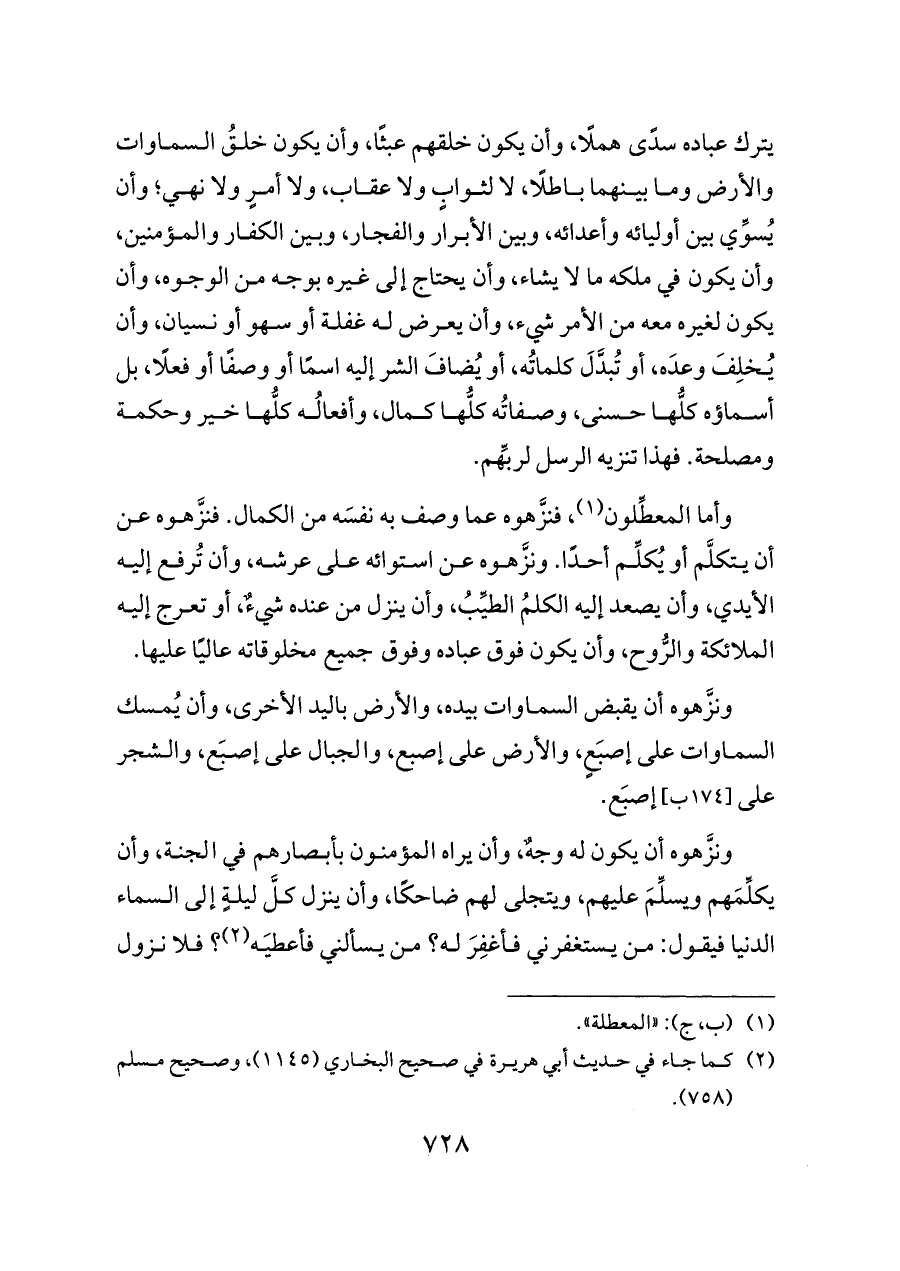 ونزَّهوه أن يكون له وجهٌ، وأن يراه المؤمنون بأبصارهم في الجنة، وأن يكلِّمَهم ويسلِّمَ عليهم، ويتجلى لهم ضاحكًا، وأن ينزل كلَّ ليلةٍ إلى السماء الدنيا فيقول: من يستغفرني فأغفِرَ له؟ من يسألني فأعطيَه (¬٢)؟ فلا نزول