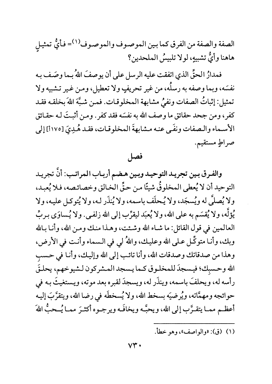 فمدارُ الحقِّ الذي اتفقت عليه الرسل على أن يوصفَ اللهُ بما وصَف به نفسَه، وبما وصفه به رسلُه، من غير تحريفٍ ولا تعطيل، ومن غير تشبيه ولا تمثيل: إثباتُ الصفات ونفيُ مشابهة المخلوقات. فمن شبَّهَ اللهَ بخلقه فقد كفر، ومن جحد حقائق ما وصف الله به نفسَه فقد كفر. ومن أثبتَ له حقائق الأسماء والصفات ونفَى عنه مشابهةَ المخلوقات، فقد هُدِيَ [١٧٥ أ] إلى صراطٍ مستقيم.