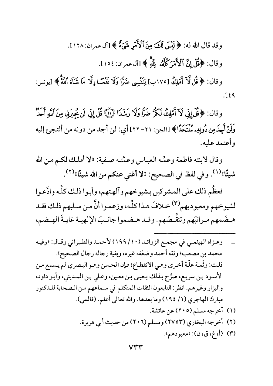 وقال لابنته فاطمة وعمِّه العباس وعمَّته صفية: «لا أملك لكم من الله شيئًا» (¬١). وفي لفظ في الصحيح: «لا أغني عنكم من الله شيئًا» (¬٢).