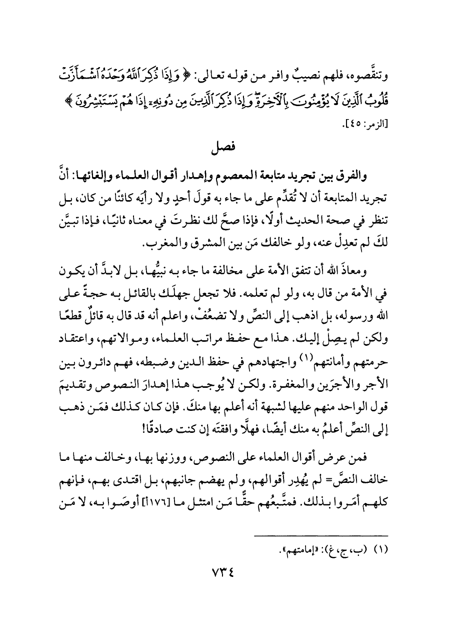 والفرق بين تجريد متابعة المعصوم وإهدار أقوال العلماء وإلغائها: أنَّ تجريد المتابعة أن لا تُقدِّم على ما جاء به قولَ أحدٍ ولا رأيَه كائنًا من كان، بل تنظر في صحة الحديث أولًا، فإذا صحَّ لك نظرتَ في معناه ثانيًا، فإذا تبيَّن لكَ لم تعدِلْ عنه، ولو خالفك مَن بين المشرق والمغرب.