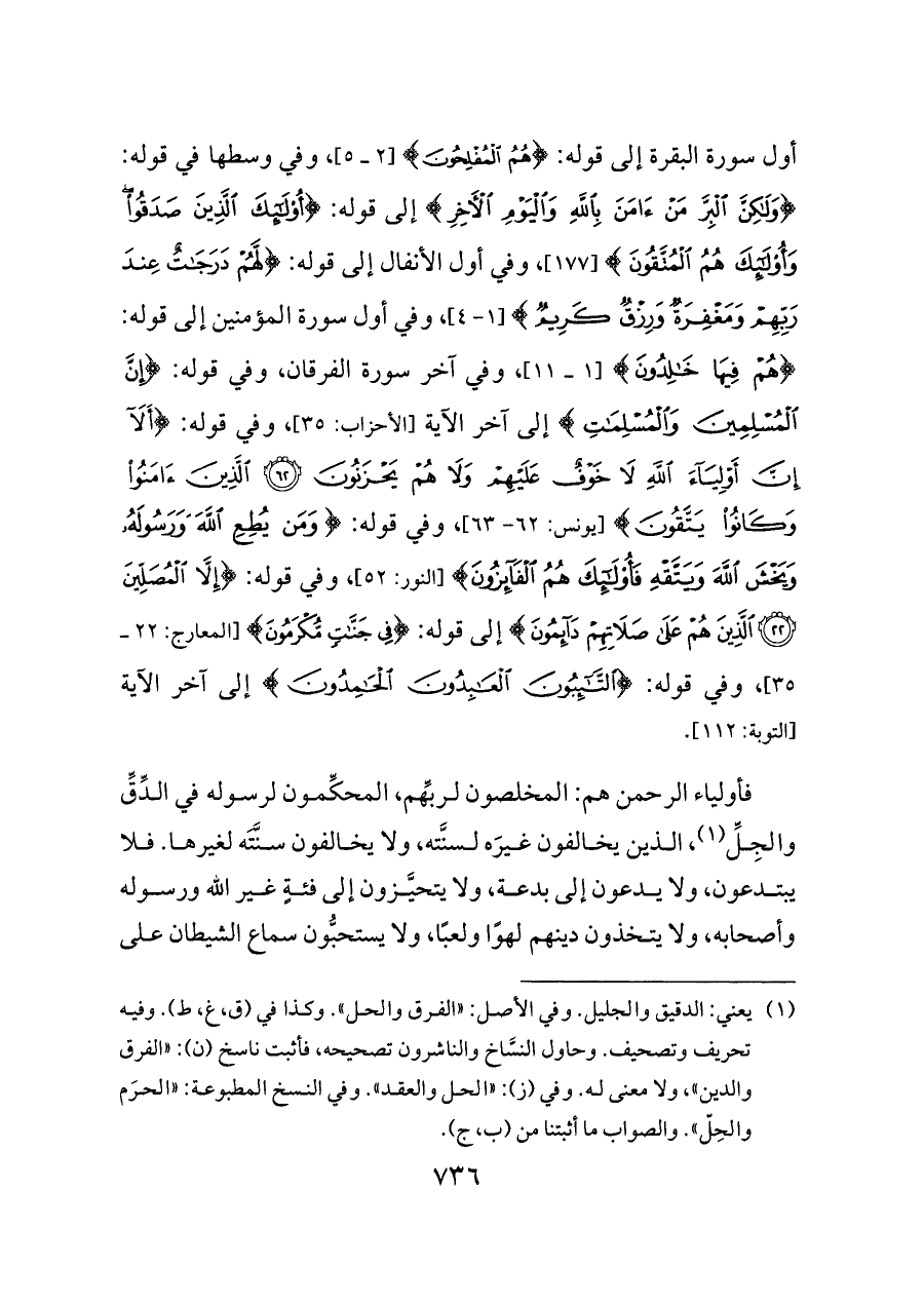 أول سورة البقرة إلى قوله: {هُمُ الْمُفْلِحُونَ} [٢ ــ ٥]، وفي وسطها في قوله: {وَلَكِنَّ الْبِرَّ مَنْ آمَنَ بِاللَّهِ وَالْيَوْمِ الْآخِرِ} إلى قوله: {أُولَئِكَ الَّذِينَ صَدَقُوا وَأُولَئِكَ هُمُ الْمُتَّقُونَ} [١٧٧]، وفي أول الأنفال إلى قوله: {لَهُمْ دَرَجَاتٌ عِنْدَ رَبِّهِمْ وَمَغْفِرَةٌ وَرِزْقٌ كَرِيمٌ} [١ - ٤]، وفي أول سورة المؤمنين إلى قوله: {هُمْ فِيهَا خَالِدُونَ} [١ ــ ١١]، وفي آخر سورة الفرقان، وفي قوله: {إِنَّ الْمُسْلِمِينَ وَالْمُسْلِمَاتِ} إلى آخر الآية [الأحزاب: ٣٥]، وفي قوله: {أَلَا إِنَّ أَوْلِيَاءَ اللَّهِ لَا خَوْفٌ عَلَيْهِمْ وَلَا هُمْ يَحْزَنُونَ (٦٢) الَّذِينَ آمَنُوا وَكَانُوا يَتَّقُونَ} [يونس: ٦٢ - ٦٣]، وفي قوله: {وَمَنْ يُطِعِ اللَّهَ وَرَسُولَهُ وَيَخْشَ اللَّهَ وَيَتَّقْهِ فَأُولَئِكَ هُمُ الْفَائِزُونَ} [النور: ٥٢]، وفي قوله: {إِلَّا الْمُصَلِّينَ (٢٢) الَّذِينَ هُمْ عَلَى صَلَاتِهِمْ دَائِمُونَ} إلى قوله: {فِي جَنَّاتٍ مُكْرَمُونَ} [المعارج: ٢٢ ــ ٣٥]، وفي قوله: {التَّائِبُونَ الْعَابِدُونَ الْحَامِدُونَ} إلى آخر الآية [التوبة: ١١٢].