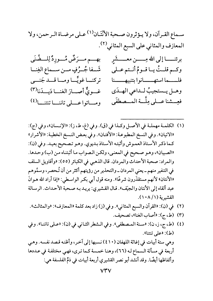 وهي ستة أبيات في إغاثة اللهفان (٤١٠) نسبها إلى آخر، وأظنه قصد نفسه. وهي أربعة في مسألة السماع له (٦٦)، وهنا خمسة كما ترى، فهي مختلفة في عددها وألفاظها أيضًا. وقد أنشد أبو نصر القشيري أربعة أبيات في ذمِّ الفلسفة هي: