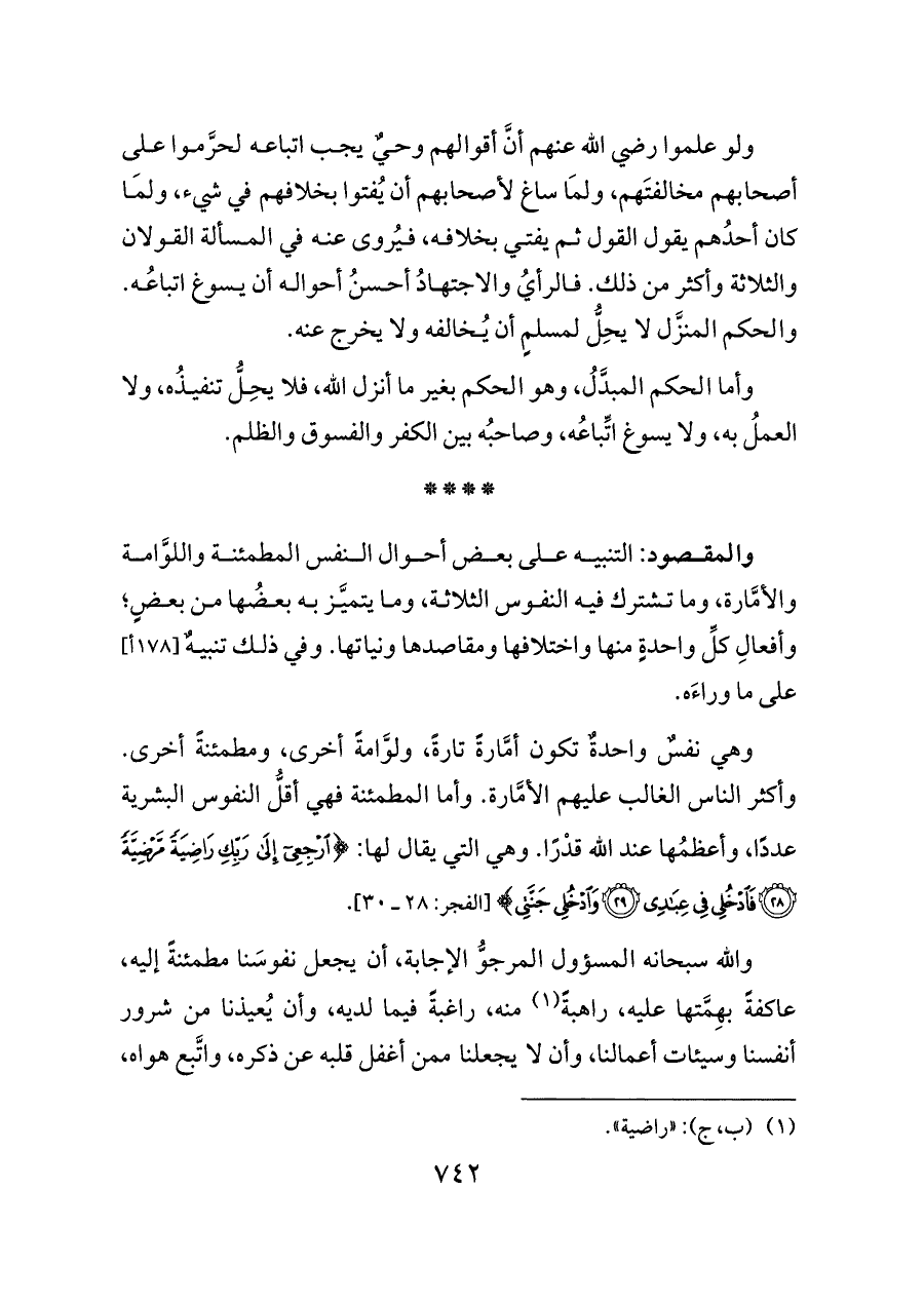 والمقصود: التنبيه على بعض أحوال النفس المطمئنة واللوَّامة والأمَّارة، وما تشترك فيه النفوس الثلاثة، وما يتميَّز به بعضُها من بعضٍ؛ وأفعالِ كلِّ واحدةٍ منها واختلافها ومقاصدها ونياتها. وفي ذلك تنبيهٌ [١٧٨ أ] على ما وراءَه.