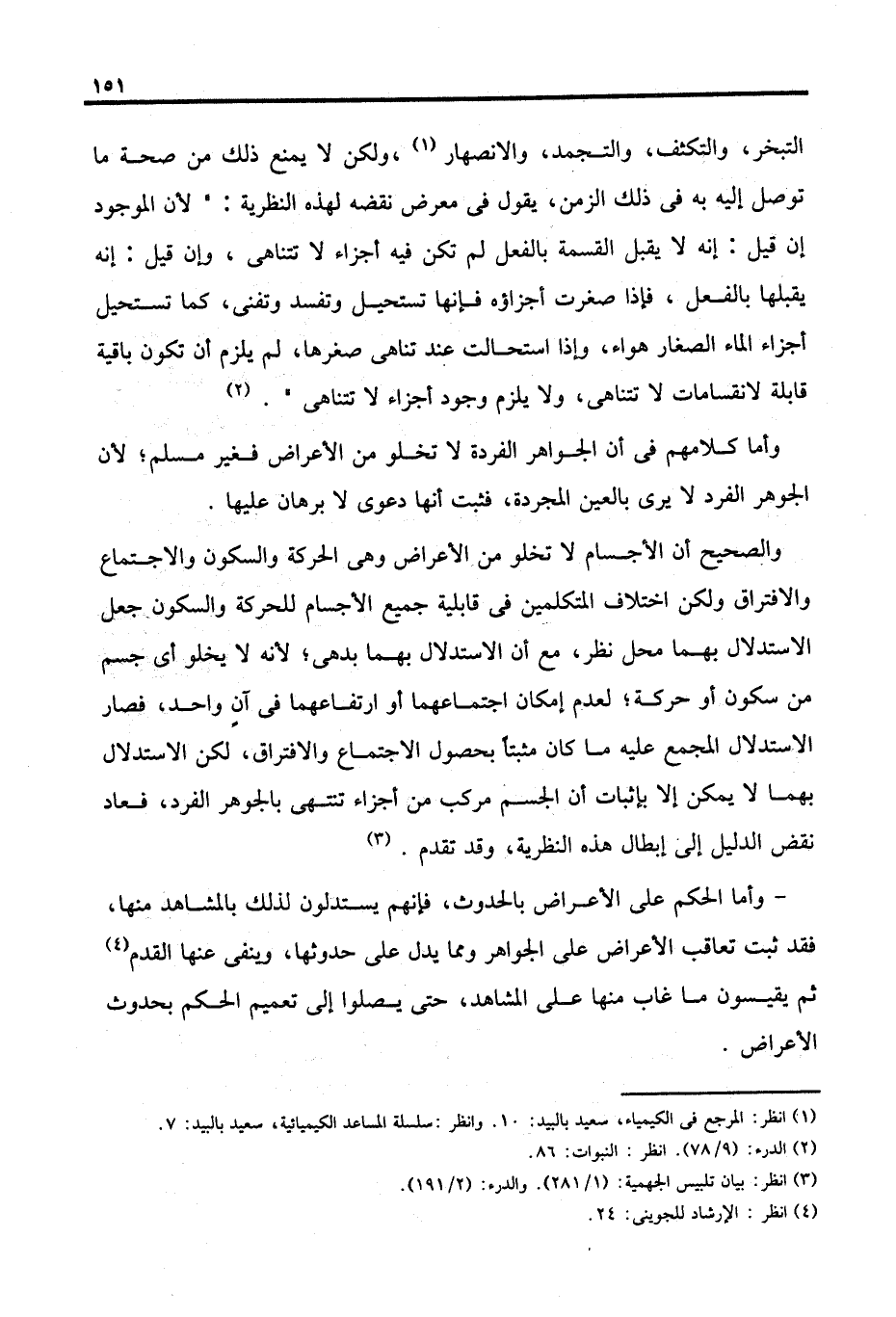 التبخر، والتكثف، والتجمد، والانصهار (١)، ولكن لا يمنع ذلك من صحة ما توصل إليه به في ذلك الزمن، يقول في معرض نقضه لهذه النظرية: "لأن الموجود إن قيل: إنه لا يقبل القسمة بالفعل لم تكن فيه أجزاء لا تتناهى، وإن قيل: إنه يقبلها بالفعل، فإذا صغرت أجزاؤه فإنها تستحيل وتفسد وتفنى، كما تستحيل أجزاء الماء الصغار هواء، وإذا استحالت عند تناهى صغرها، لم يلزم أن تكون باقية قابلة لانقسامات لا تتناهى، ولا يلزم وجود أجزاء لا تتناهى". (٢)