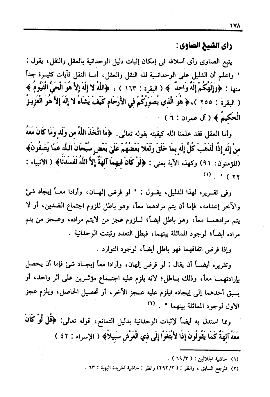 وأما العقل فقد علمنا الله كيفيته بقوله تعالى: {مَا اتَّخَذَ اللَّهُ مِنْ وَلَدٍ وَمَا كَانَ مَعَهُ مِنْ إِلَهٍ إِذًا لَذَهَبَ كُلُّ إِلَهٍ بِمَا خَلَقَ وَلَعَلَا بَعْضُهُمْ عَلَى بَعْضٍ سُبْحَانَ اللَّهِ عَمَّا يَصِفُونَ} [المؤمنون: ٩١] وكهذه الآية يعني: {لَوْ كَانَ فِيهِمَا آلِهَةٌ إِلَّا اللَّهُ لَفَسَدَتَا} [الأنبياء: ٢٢] ". (١)