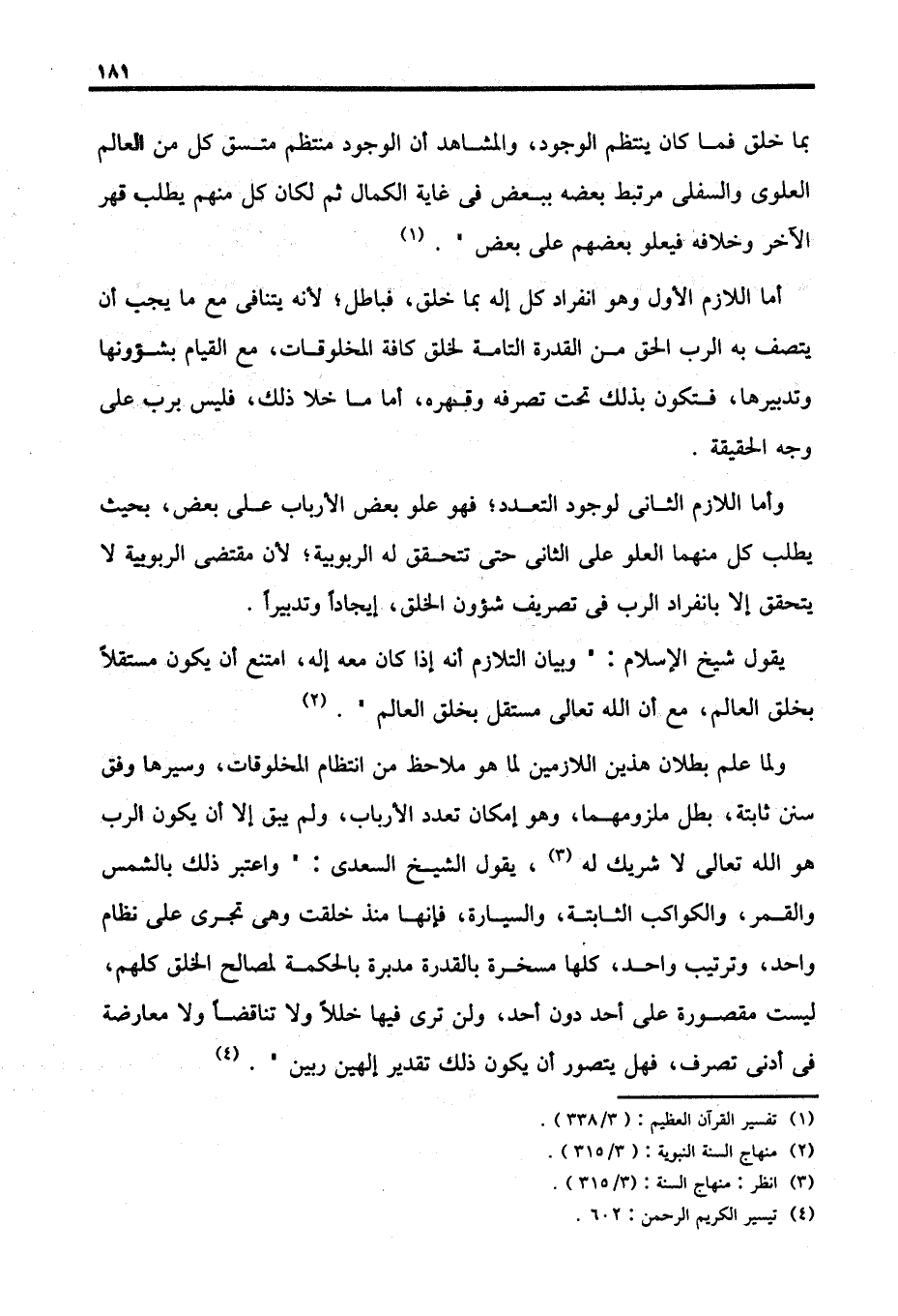 ولما علم بطلان هذين اللازمين لما هو ملاحظ من انتظام المخلوقات، وسيرها وفق سنن ثابتة، بطل ملزومهما، وهو إمكان تعدد الأرباب، ولم يبق إلا أن يكون الرب هو الله تعالى لا شريك له (٣)، يقول الشيخ السعدى: "واعتبر ذلك بالشمس والقمر، والكواكب الثابتة، والسيارة، فإنها منذ خلقت وهى تجري على نظام واحد، وترتيب واحد، كلها مسخرة بالقدرة مدبرة بالحكمة لمصالح الخلق كلهم، ليست مقصورة على أحد دون أحد، ولن ترى فيها خللًا ولا تناقضًا ولا معارضة في أدنى تصرف، فهل يتصور أن يكون ذلك تقدير إلهين ربين". (٤)