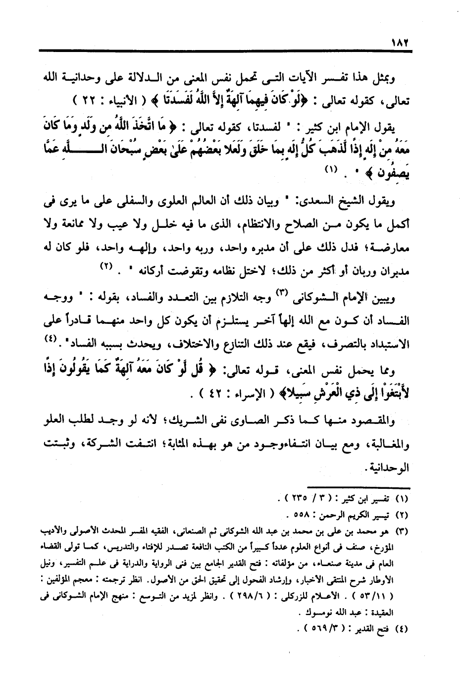 ويقول الشيخ السعدى: "وبيان ذلك أن العالم العلوى والسفلى على ما يرى في أكمل ما يكون من الصلاح والانتظام، الذي ما فيه خلل ولا عيب ولا ممانعة ولا معارضة؛ فدل ذلك على أن مدبره واحد، وربه واحد، وإلهه واحد، فلو كان له مدبران وربان أو أكثر من ذلك؛ لاختل نظامه وتقوضت أركانه". (٢)