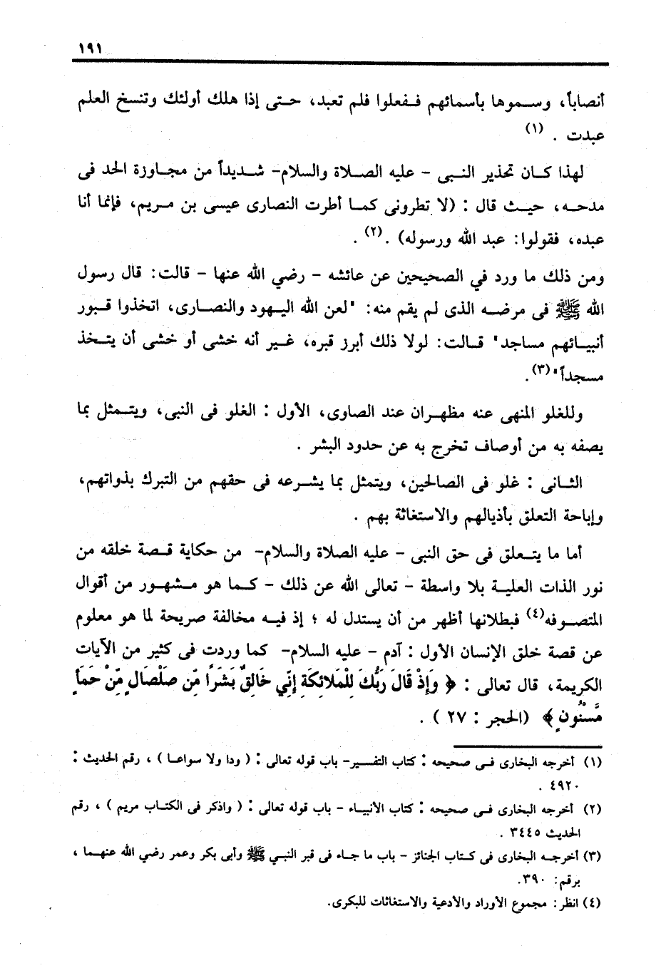 لهذا كان تحذير النبي - عليه الصلاة والسلام - شديدًا من مجاورة الحد في مدحه، حيث قال: (لا تطرونى كما أطرت النصارى عيسى بن مريم، فإنما أنا عبده، فقولوا: عبد الله ورسوله). (٢).