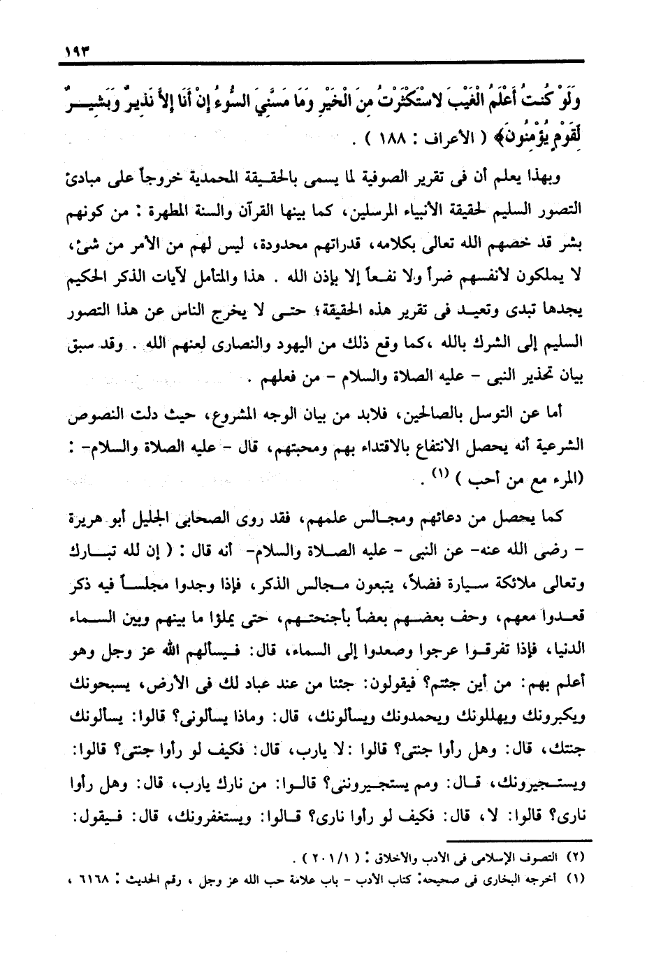 وبهذا يعلم أن في تقرير الصوفية لما يسمى بالحقيقة المحمدية خروجًا على مبادئ التصور السليم لحقيقة الأنبياء المرسلين، كما بينها القرآن والسنة المطهرة: من كونهم بشر قد خصهم الله تعالى بكلامه، قدراتهم محدودة، ليس لهم من الأمر من شيء، لا يملكون لأنفسهم ضرًا ولا نفعًا إلا بإذن الله. هذا والمتأمل لآيات الذكر الحكيم يجدها تبدى وتعيد في تقرير هذه الحقيقة؛ حتى لا يخرج الناس عن هذا التصور السليم إلى الشرك بالله، كما وقع ذلك من اليهود والنصارى لعنهم الله. وقد سبق بيان تحذير النبي - عليه الصلاة والسلام - من فعلهم.