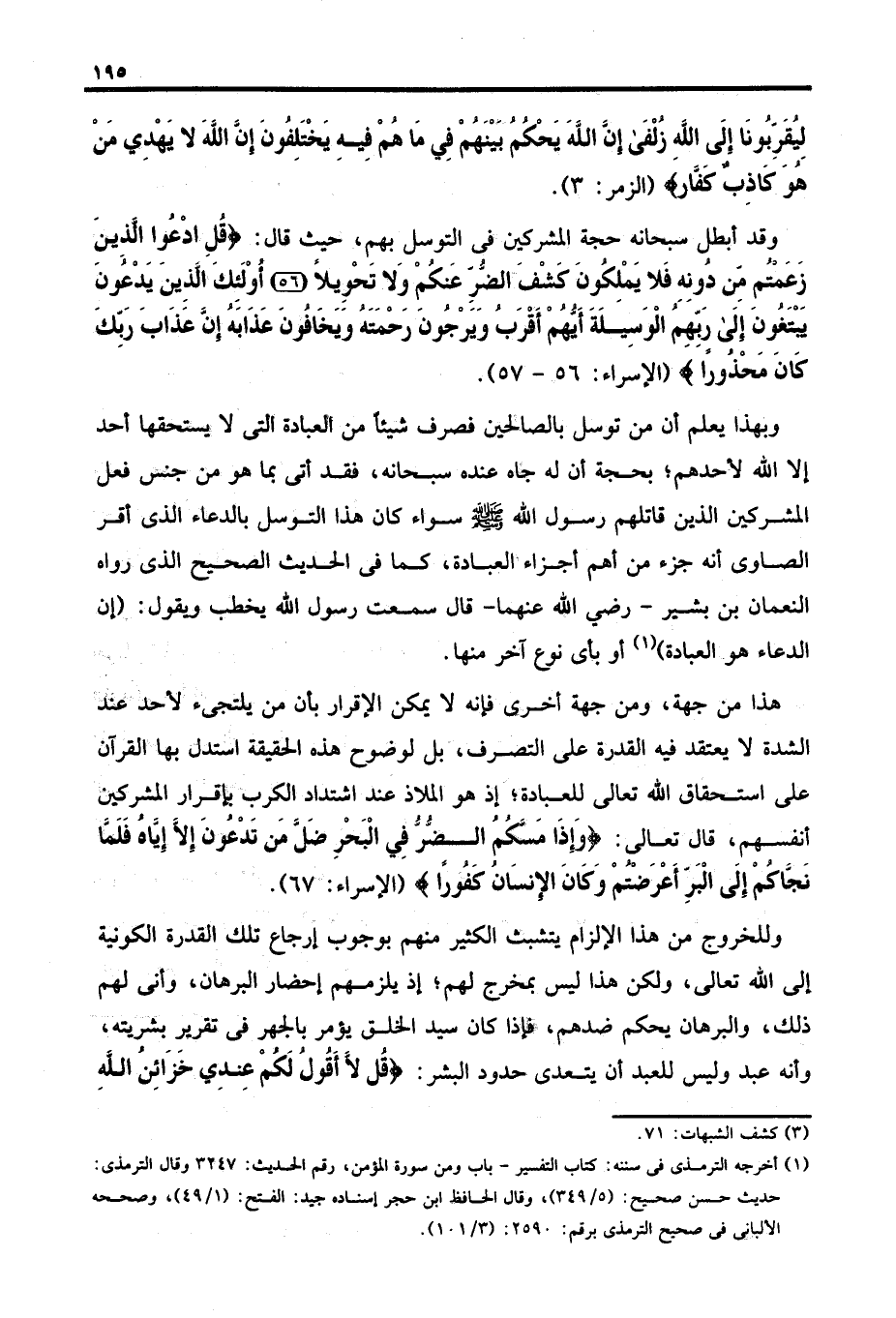 وبهذا يعلم أن من توسل بالصالحين فصرف شيئًا من العبادة التي لا يستحقها أحد إلا الله لأحدهم؛ بحجة أن له جاه عنده سبحانه، فقد أتى بما هو من جنس فعل المشركين الذين قاتلهم رسول الله - صلى الله عليه وسلم - سواء كان هذا التوسل بالدعاء الذي أقر الصاوى أنه جزء من أهم أجزاء العبادة، كما في الحديث الصحيح الذي رواه النعمان بن بشير - رضي الله عنهما - قال سمعت رسول الله يخطب ويقول: (إن الدعاء هو العبادة) (١) أو بأى نوع آخر منها.