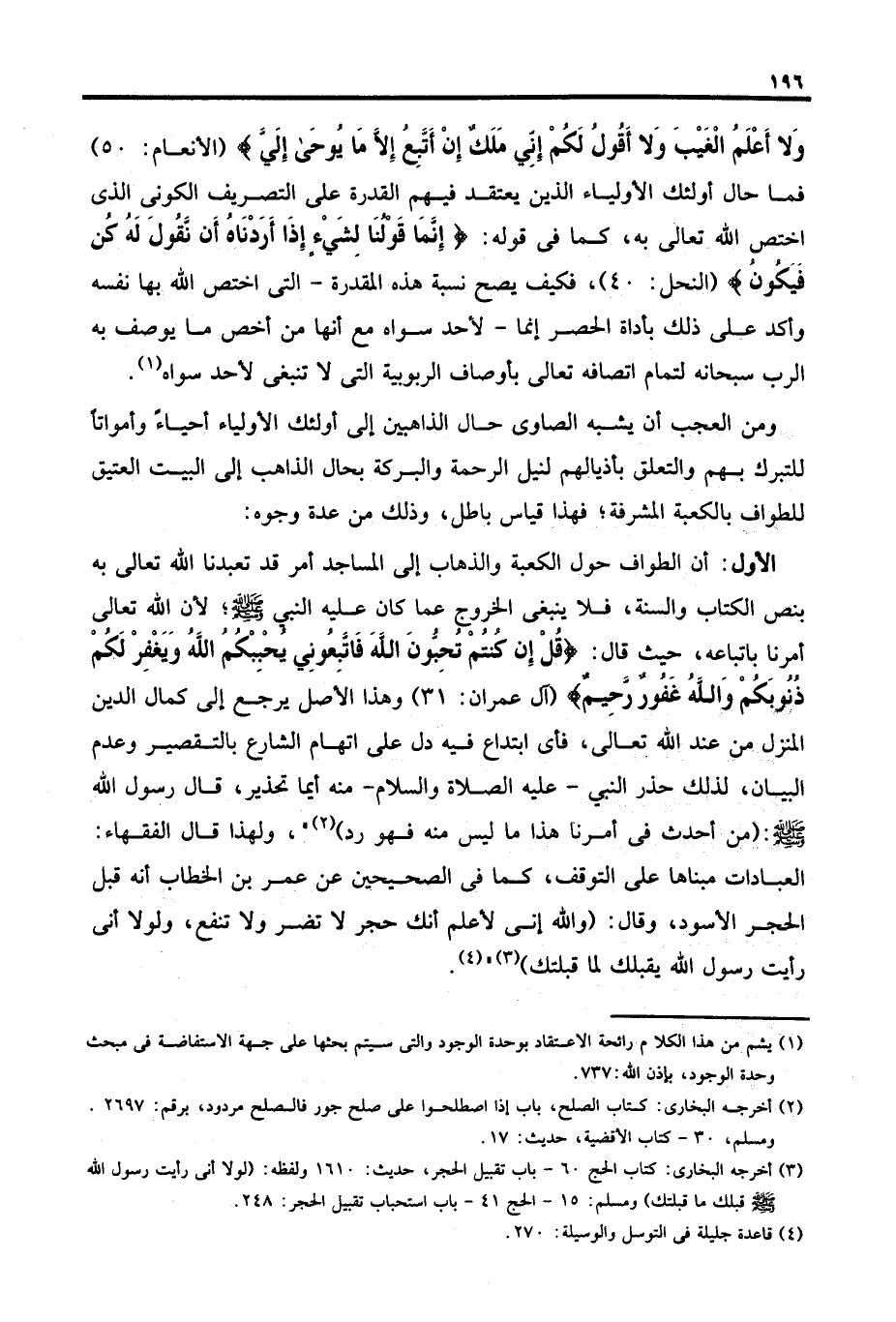 الأول: أن الطواف حول الكعبة والذهاب إلى المساجد أمر قد تعبدنا الله تعالى به بنص الكتاب والسنة، فلا ينبغى الخروج عما كان عليه النبي - صلى الله عليه وسلم -؛ لأن الله تعالى أمرنا باتباعه، حيث قال: {قُلْ إِنْ كُنْتُمْ تُحِبُّونَ اللَّهَ فَاتَّبِعُونِي يُحْبِبْكُمُ اللَّهُ وَيَغْفِرْ لَكُمْ ذُنُوبَكُمْ وَاللَّهُ غَفُورٌ رَحِيمٌ} [آل عمران: ٣١] وهذا الأصل يرجع إلى كمال الدين المنزل من عند الله تعالى، فأى ابتداع فيه دل على اتهام الشارع بالتقصير وعدم البيان، لذلك حذر النبي - عليه الصلاة والسلام - منه أيما تحذير، قال رسول الله - صلى الله عليه وسلم -: (من أحدث في أمرنا هذا ما ليس منه فهو رد) (٢) "، ولهذا قال الفقهاء: العبادات مبناها على التوقف، كما في الصحيحين عن عمر بن الخطاب أنه قبل الحجر الأسود، وقال: (والله إني لأعلم أنك حجر لا تضر ولا تنفع، ولولا أنى رأيت رسول الله يقبلك لما قبلتك) (٣) " (٤).