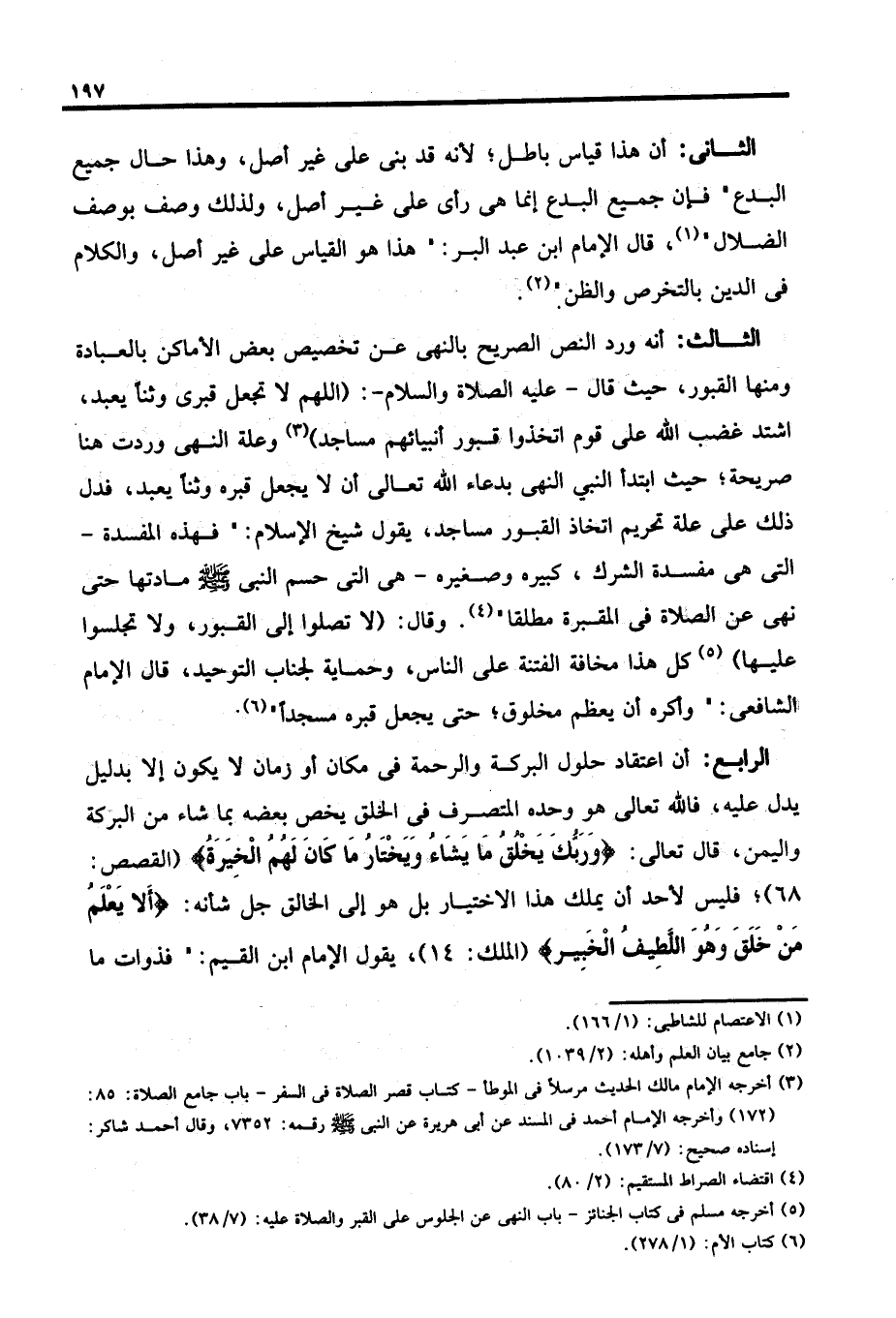 الثالث: أنه ورد النص الصريح بالنهى عن تخصيص بعض الأماكن بالعبادة ومنها القبور، حيث قال - عليه الصلاة والسلام -: (اللهم لا تجعل قبرى وثنًا يعبد، اشتد غضب الله على قوم اتخذوا قبور أنبيائهم مساجد) (٣) وعلة النهى وردت هنا صريحة؛ حيث ابتدأ النبي النهى بدعاء الله تعالى أن لا يجعل قبره وثنًا يعبد، فدل ذلك على علة تحريم اتخاذ القبور مساجد، يقول شيخ الإسلام: "فهذه المفسدة - التي هي مفسدة الشرك، كبيره وصغيره - هي التي حسم النبي - صلى الله عليه وسلم - مادتها حتى نهى عن الصلاة في المقبرة مطلقا" (٤). وقال: (لا تصلوا إلى القبور، ولا تجلسوا عليها) (٥) كل هذا مخافة الفتنة على الناس، وحماية لجناب التوحيد، قال الإمام الشافعي: "وأكره أن يعظم مخلوق؛ حتى يجعل قبره مسجدًا" (٦).