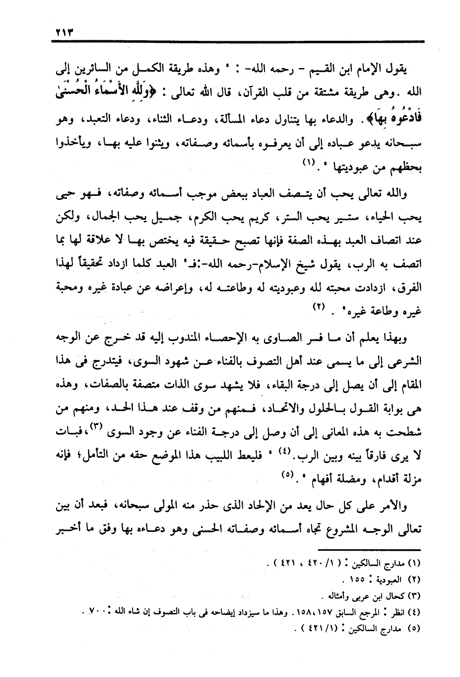 يقول الإمام ابن القيم - رحمه الله -: "وهذه طريقة الكمل من السائرين إلى الله. وهى طريقة مشتقة من قلب القرآن، قال الله تعالى: {وَلِلَّهِ الْأَسْمَاءُ الْحُسْنَى فَادْعُوهُ بِهَا}. والدعاء بها يتناول دعاء المسألة، ودعاء الثناء، ودعاء التعبد، وهو سبحانه يدعو عباده إلى أن يعرفوه بأسمائه وصفاته، ويثنوا عليه بها، ويأخذوا بحظهم من عبوديتها". (١)