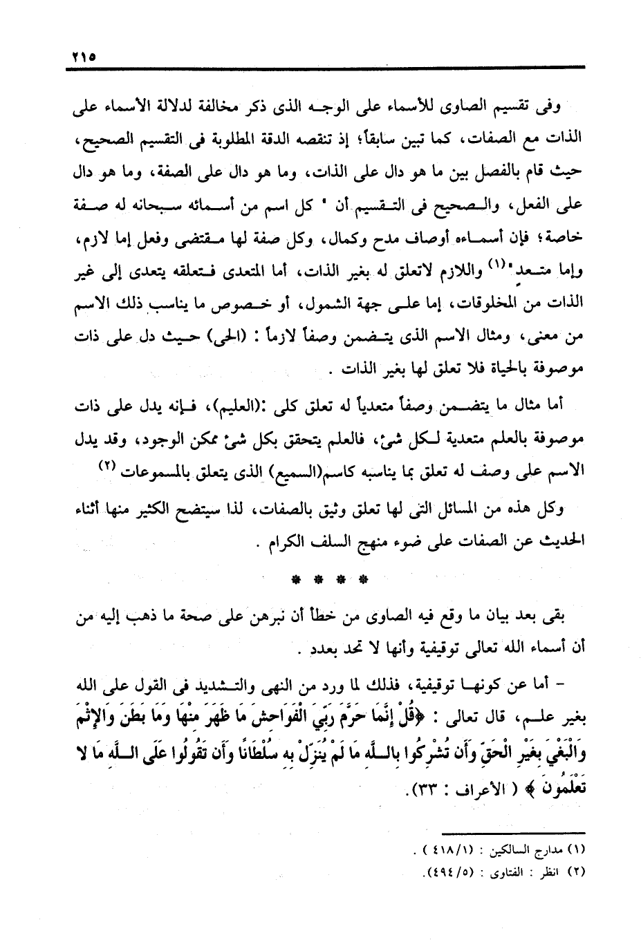 وفى تقسيم الصاوي للأسماء على الوجه الذي ذكر مخالفة لدلالة الأسماء على الذات مع الصفات، كما تبين سابقًا؛ إذ تنقصه الدقة المطلوبة في التقسيم الصحيح، حيث قام بالفصل بين ما هو دال على الذات، وما هو دال على الصفة، وما هو دال على الفعل، والصحيح في التقسيم أن "كل اسم من أسمائه سبحانه له صفة خاصة؛ فإن أسماءه أوصاف مدح وكمال، وكل صفة لها مقتضى وفعل إما لازم، وإما متعدٍ" (١) واللازم لا تعلق له. بغير الذات، أما المتعدى فتعلقه يتعدى إلى غير الذات من المخلوقات، إما على جهة الشمول، أو خصوص ما يناسب ذلك الاسم من معنى، ومثال الاسم الذي يتضمن وصفًا لازمًا: (الحى) حيث دل على ذات موصوفة بالحياة فلا تعلق لها بغير الذات.