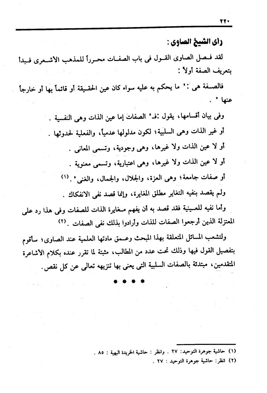 لقد فصل الصاوى القول في باب الصفات محررًا للمذهب الأشعرى فبدأ بتعريف الصفة أولًا: