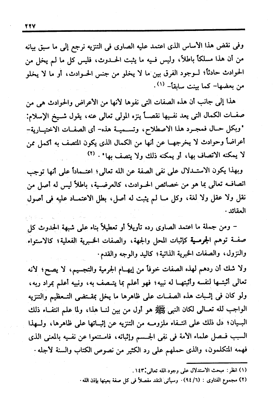 وبهذا يكون الاستدلال على نفى الصفة عن الله تعالى؛ اعتمادًا على أنها توجب اتصافه تعالى بما هو من خصائص الحوادث، كالعرضية، باطلًا ليس له أصل من نقل ولا عقل ولا لغة، وكل ما لم يثبت له أصل، بطل الاعتماد عليه في أصول العقائد.