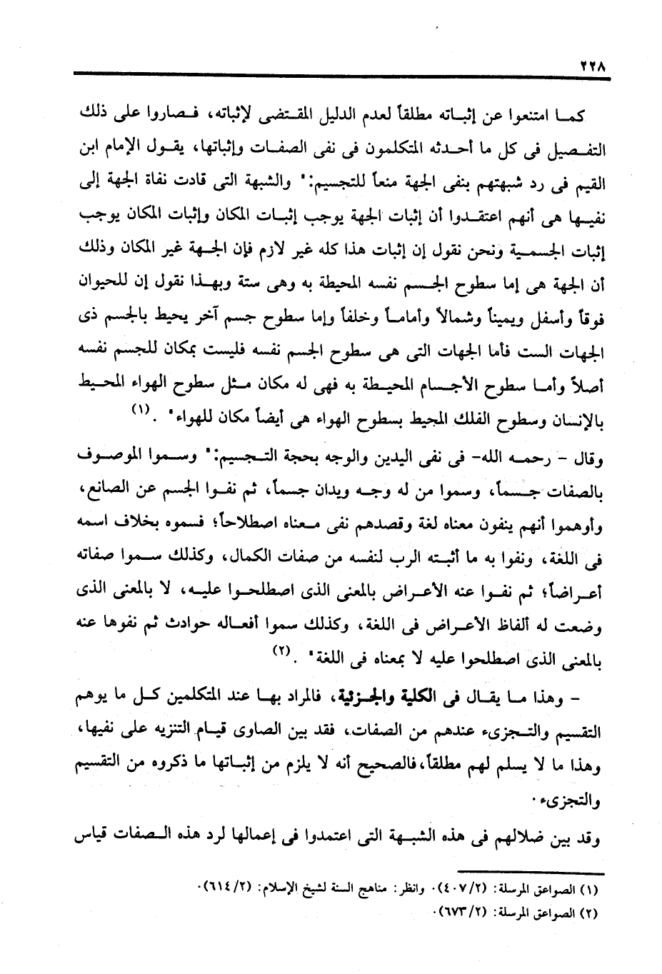 كما امتنعوا عن إثباته مطلقًا لعدم الدليل المقتضى لإثباته، فصاروا على ذلك التفصيل في كل ما أحدثه المتكلمون في نفى الصفات وإثباتها، يقول الإمام ابن القيم في رد شبهتهم بنفى الجهة منعًا للتجسيم: "والشبهة التي قادت نفاة الجهة إلى نفيها هي أنهم اعتقدوا أن إثبات الجهة يوجب إثبات المكان وإثبات المكان يوجب إثبات الجسمية ونحن نقول إن إثبات هذا كله غير لازم فإن الجهة غير المكان وذلك أن الجهة هي إما سطوح الجسم نفسه المحيطة به وهى ستة وبهذا نقول إن للحيوان فوقًا وأسفل ويمينًا وشمالًا وأمامًا وخلفًا وإما سطوح جسم آخر يحيط بالجسم ذى الجهات الست فأما الجهات التي هي سطوح الجسم نفسه فليست بمكان للجسم نفسه أصلًا وأما سطوح الأجسام المحيطة به فهى له مكان مثل سطوح الهواء المحيط بالإنسان وسطوح الفلك المحيط بسطوح الهواء هي أيضًا مكان للهواء". (١)