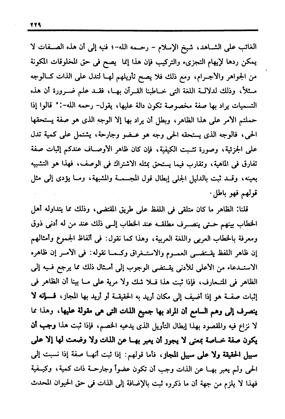 الغائب على الشاهد، شيخ الإسلام - رحمه الله -؛ فنبه إلى أن هذه الصفات لا يمكن ردها لإيهام التجزئ والتركيب فإن هذا إنما يصح في حق المخلوقات المكونة من الجواهر والأجرام، ومع ذلك فلا يصح تأويلهم لها لتدل على الذات كالوجه مثلًا، وذلك لدلالة اللغة التي خاطبنا القرآن بها، فقد علم ضرورة أن هذه التسميات يراد بها صفة مخصوصة تكون دالة عليها، يقول - رحمه الله -: "قالوا إذا حملتم الأمر على هذا الظاهر، وبطل أن يراد بها إلا الوجه الذي هو صفة يستحقها الحى، فالوجه الذي يستحقه الحى وجه هو عضو وجارحة، يشتمل على كمية تدل على الجزئية، وصورة تثبت الكيفية، فإن كان ظاهر الأوصاف عندكم إثبات صفة تفارق في الماهية، وتقارب فيما يستحق بمثله الاشتراك في الوصف، فهذا هو التشبيه بعينه، وقد ثبت بالدليل الجلى إبطال قول المجسمة والمشبهة، وما يؤدى إلى مثل قولهم فهو باطل.