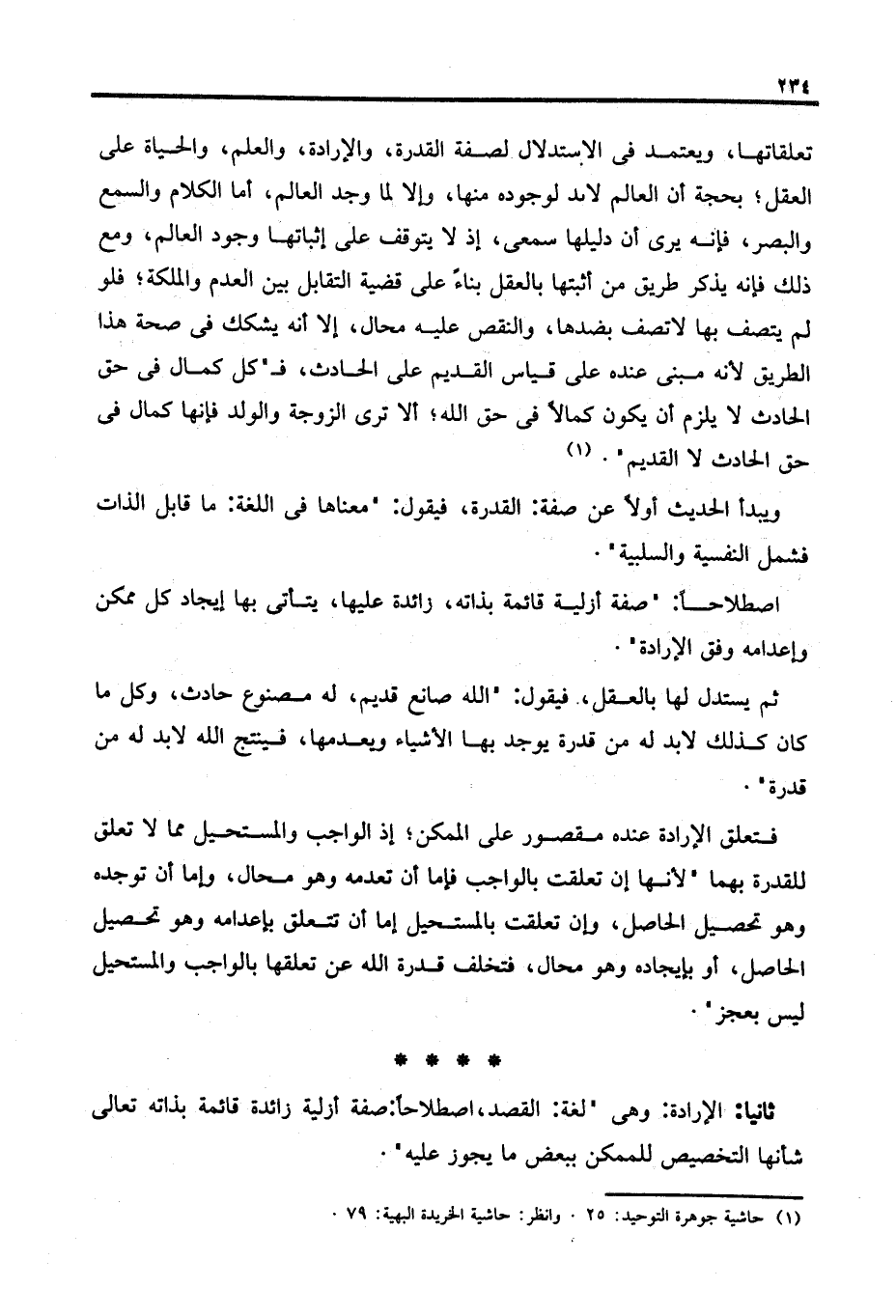 ثانيًا: الإرادة وهى "لغة: القصد، اصطلاحًا: صفة أزلية زائدة قائمة بذاته تعالى شأنها التخصيص للممكن ببعض ما يجوز عليه".