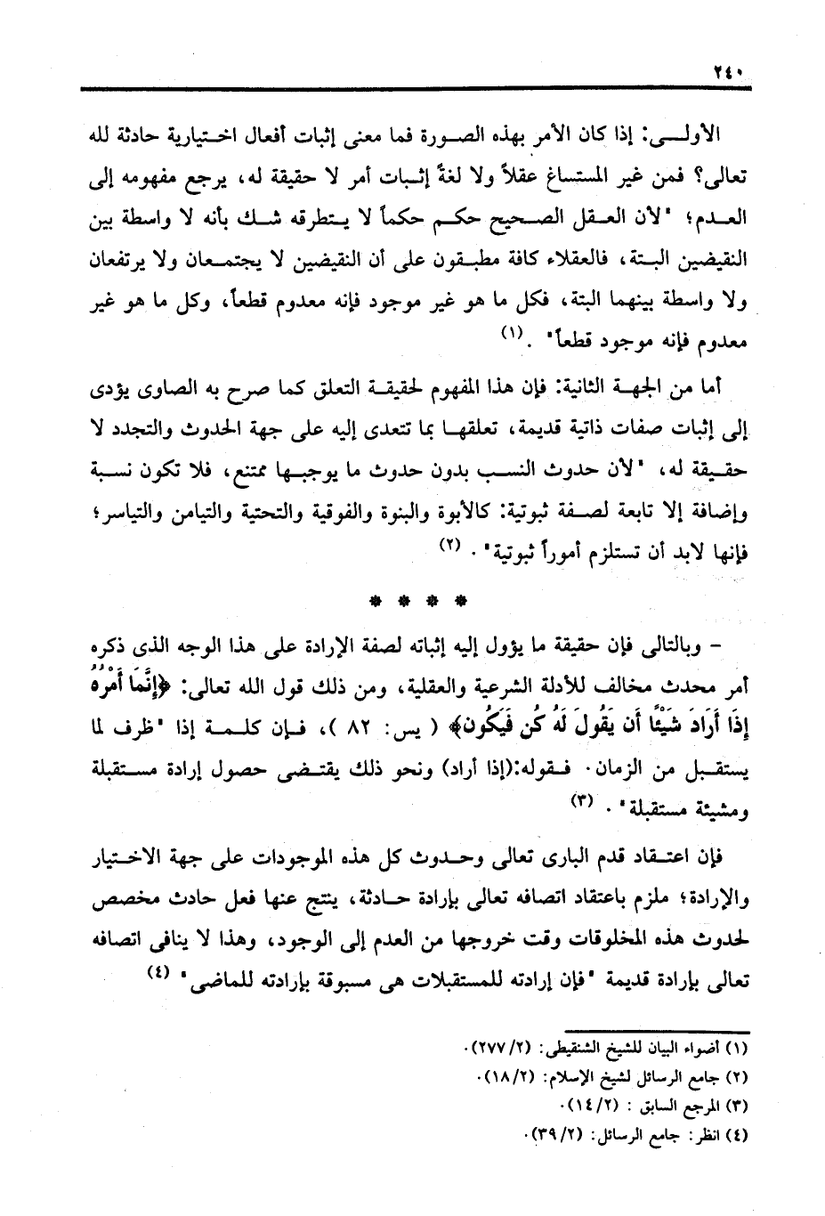 - وبالتالى فإن حقيقة ما يؤول إليه إثباته لصفة الإرادة على هذا الوجه الذي ذكره أمر محدث مخالف للأدلة الشرعية والعقلية، ومن ذلك قول الله تعالى: {إِنَّمَا أَمْرُهُ إِذَا أَرَادَ شَيْئًا أَنْ يَقُولَ لَهُ كُنْ فَيَكُونُ} [يس: ٨٢]، فإن كلمة إذا "ظرف لما يستقبل من الزمان. فقوله: (إذا أراد) ونحو ذلك يقتضى حصول إرادة مستقبلة ومشيئة مستقبلة" (٣)